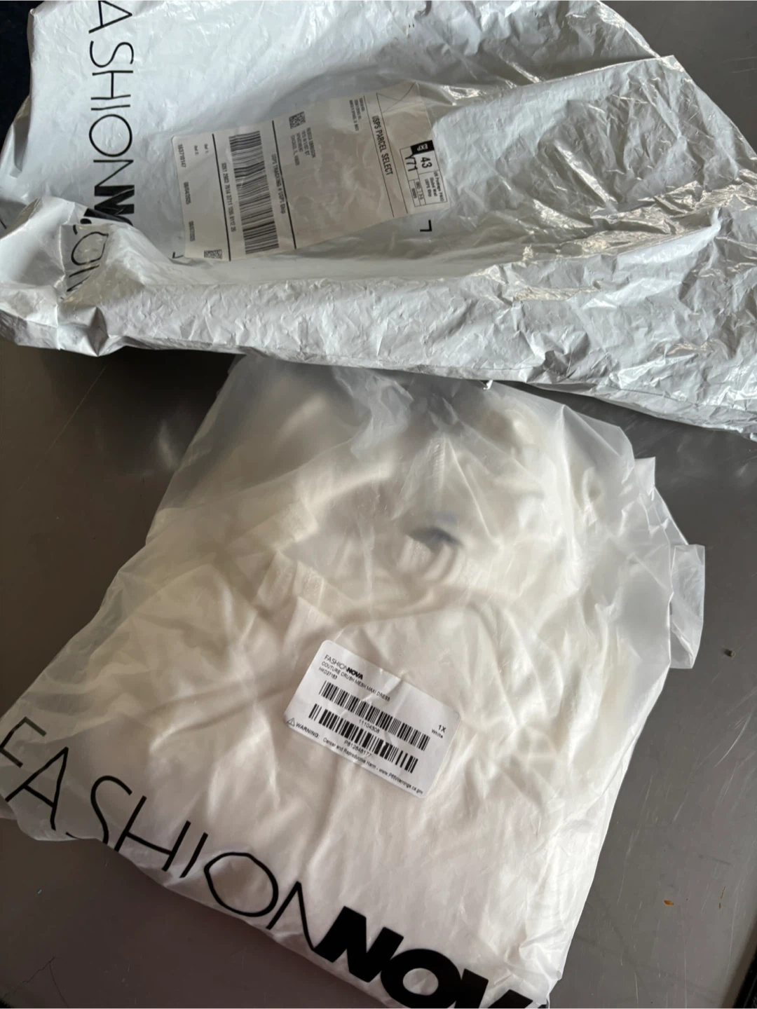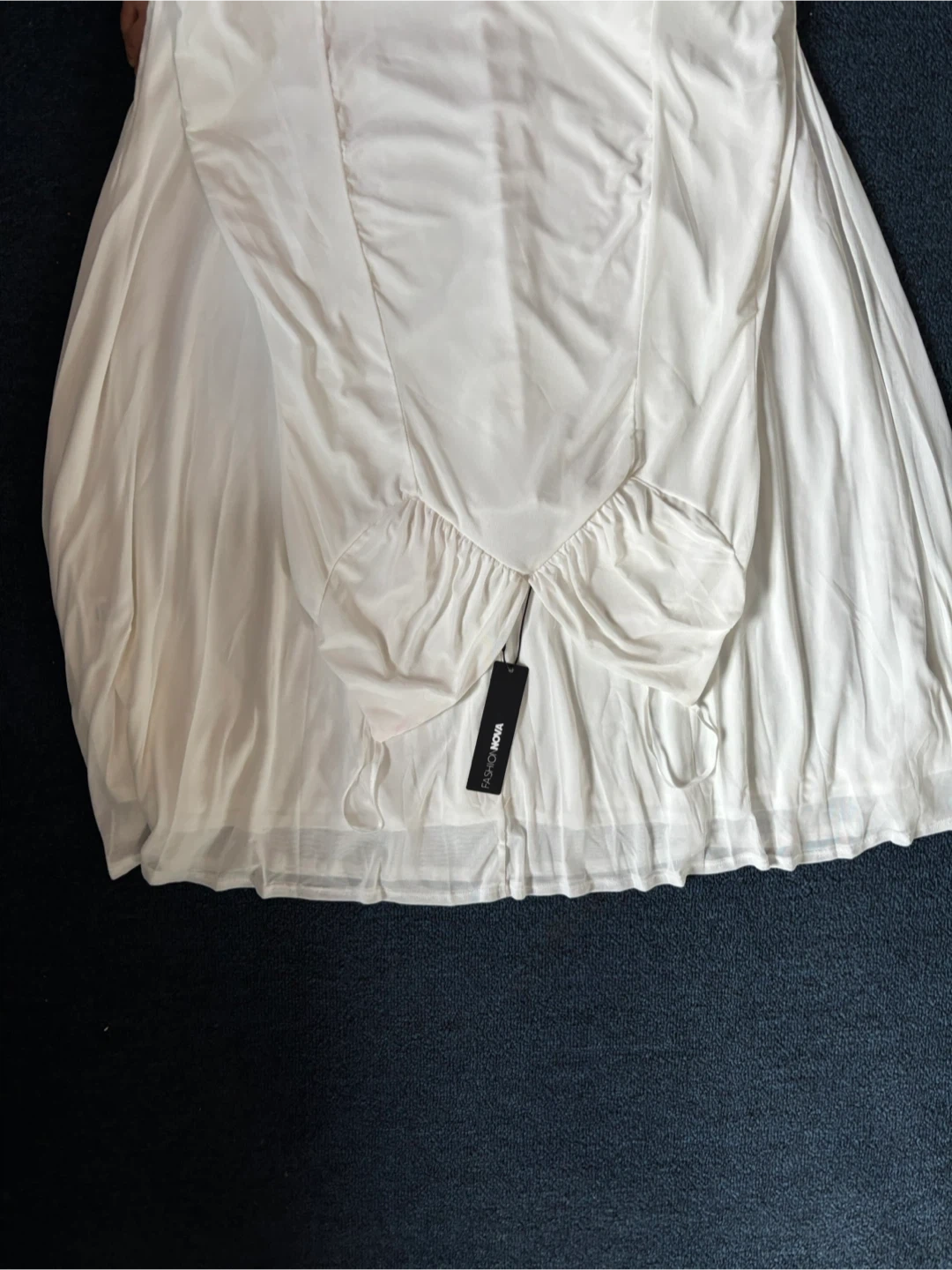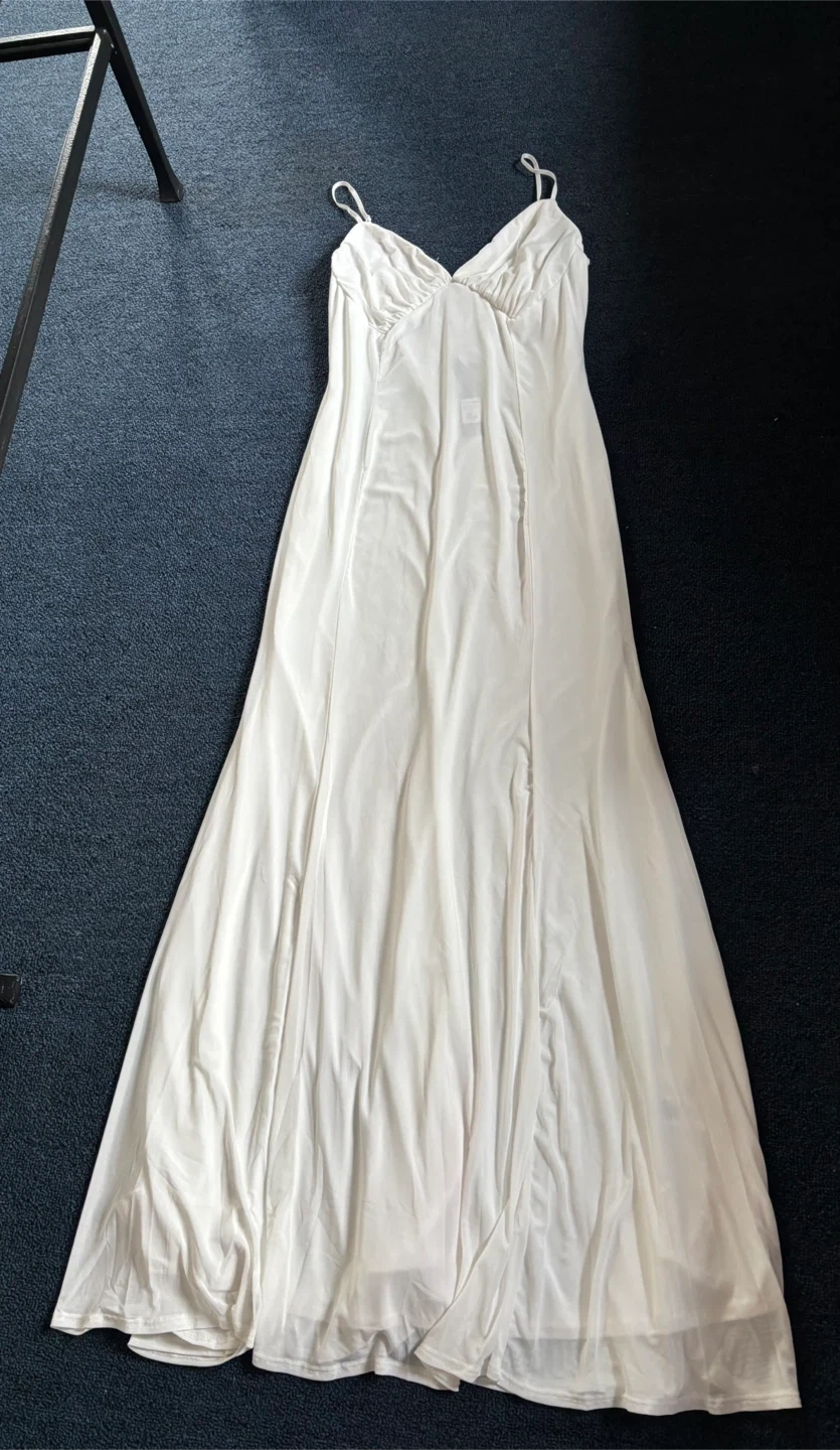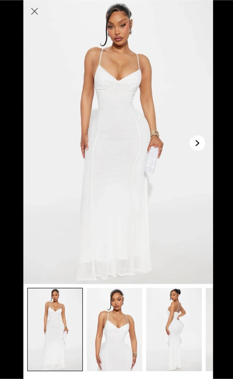 This is a white maxi dress from Fashion Nova. It's a size medium and features thin spaghetti straps with a ruched bust detail. The skirt has a sheer overlay for added elegance.