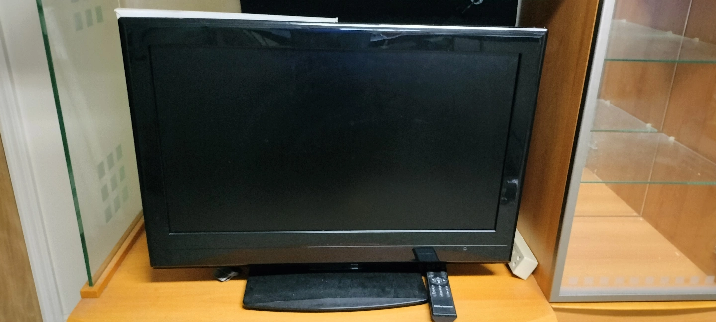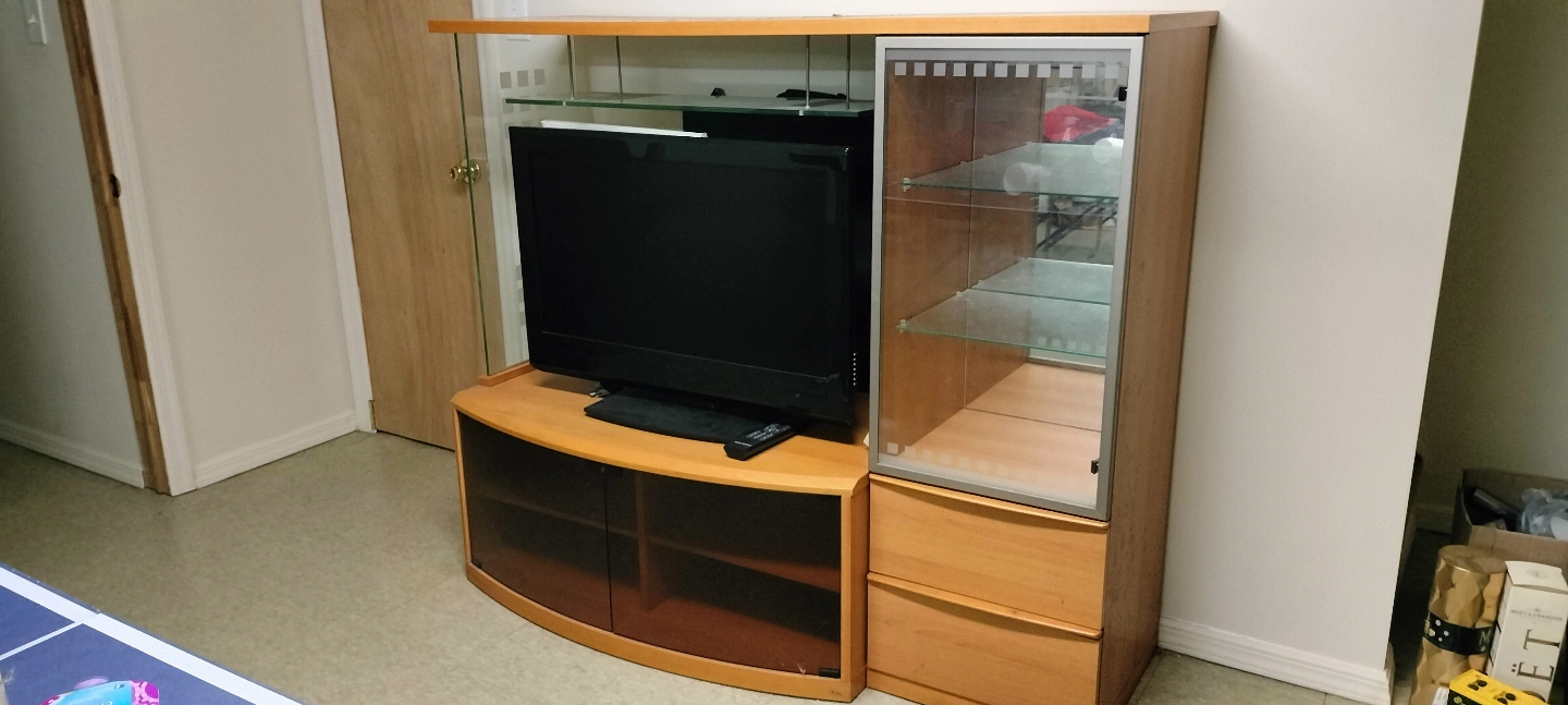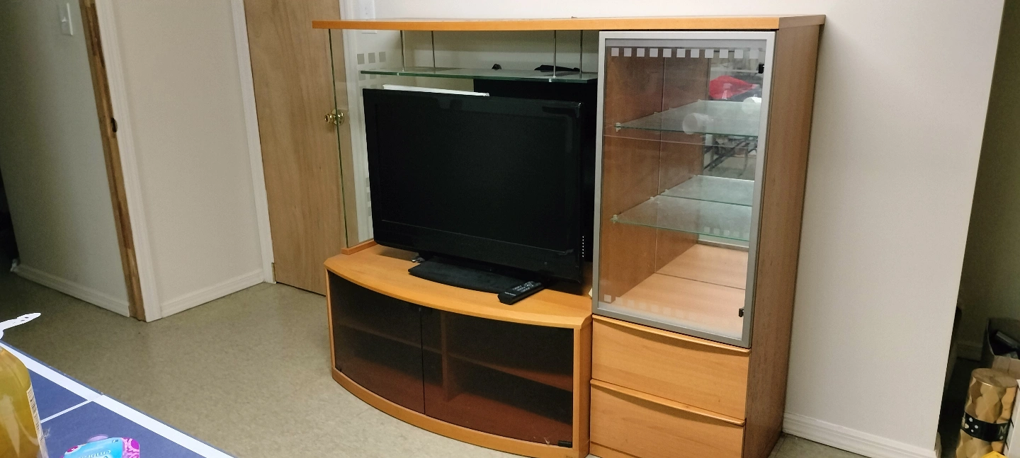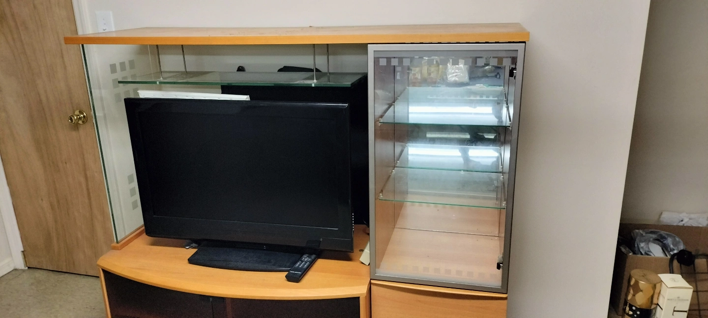 Wooden entertainment center. Features glass doors and shelves. Includes a curved base with additional storage. Good for TV and collectibles. Also come with 43" Led TV.