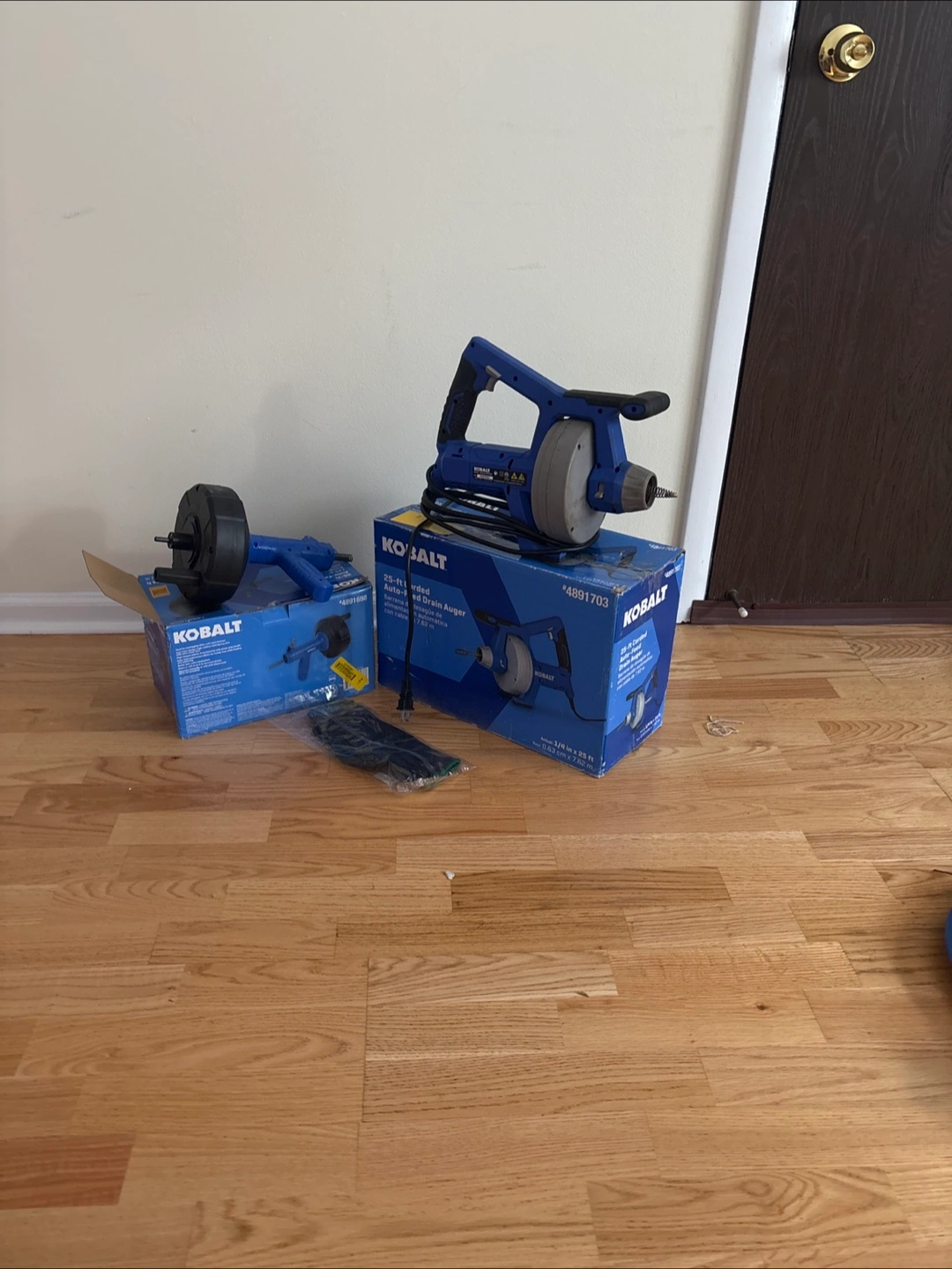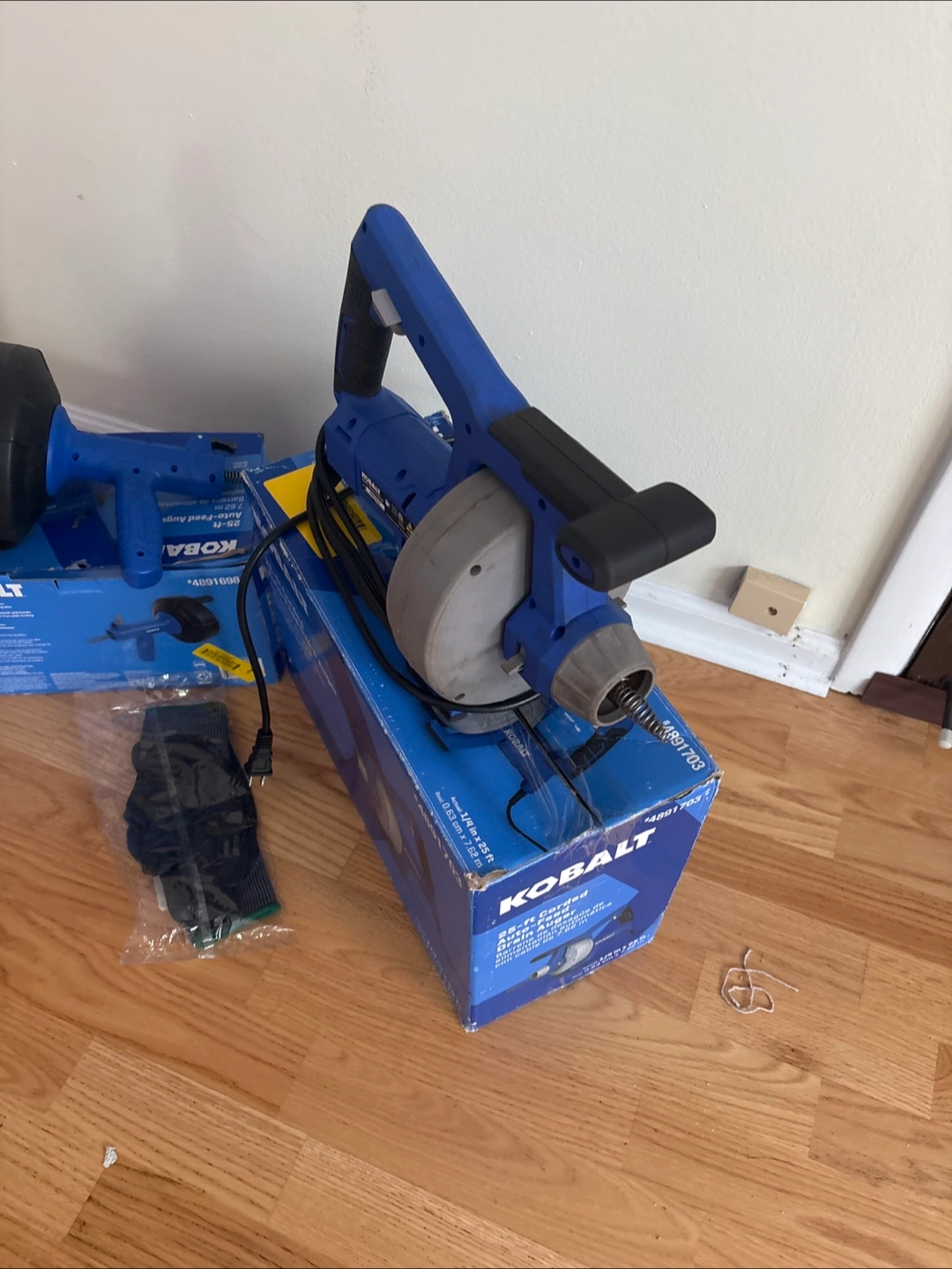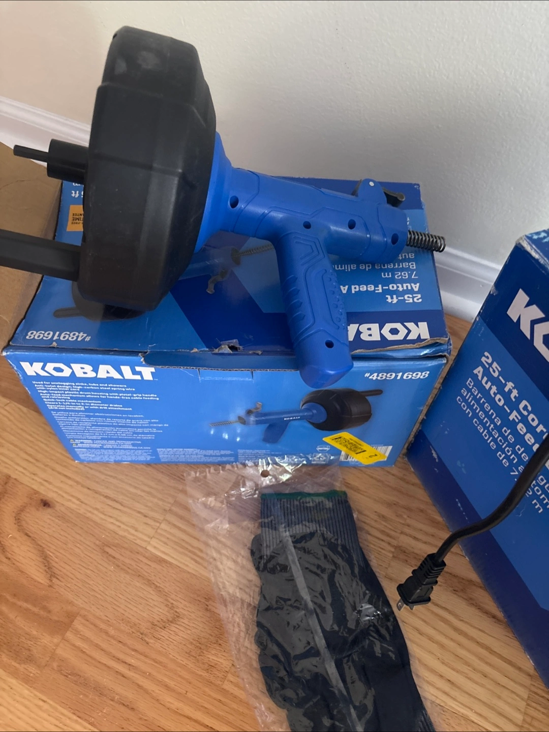 I'm selling a brand new Kobalt 25-ft Auto-Feed Drain Auger! And hand held It's still in the original box and has never been used. It's a great tool for clearing clogged drains quickly and easily! Comes with the original box and components.