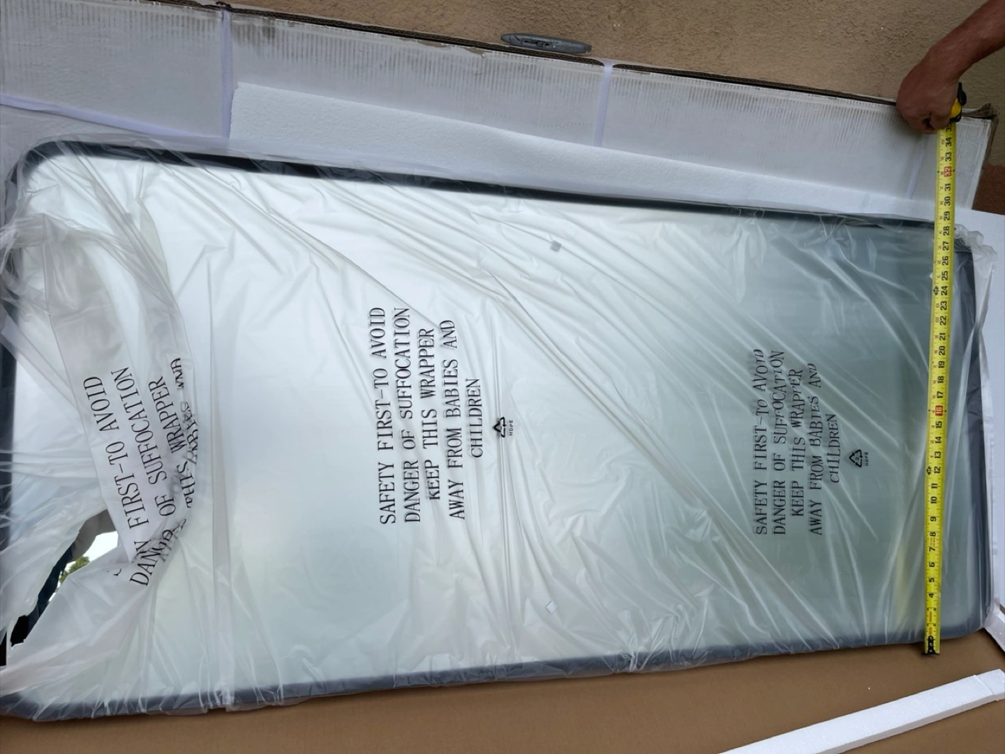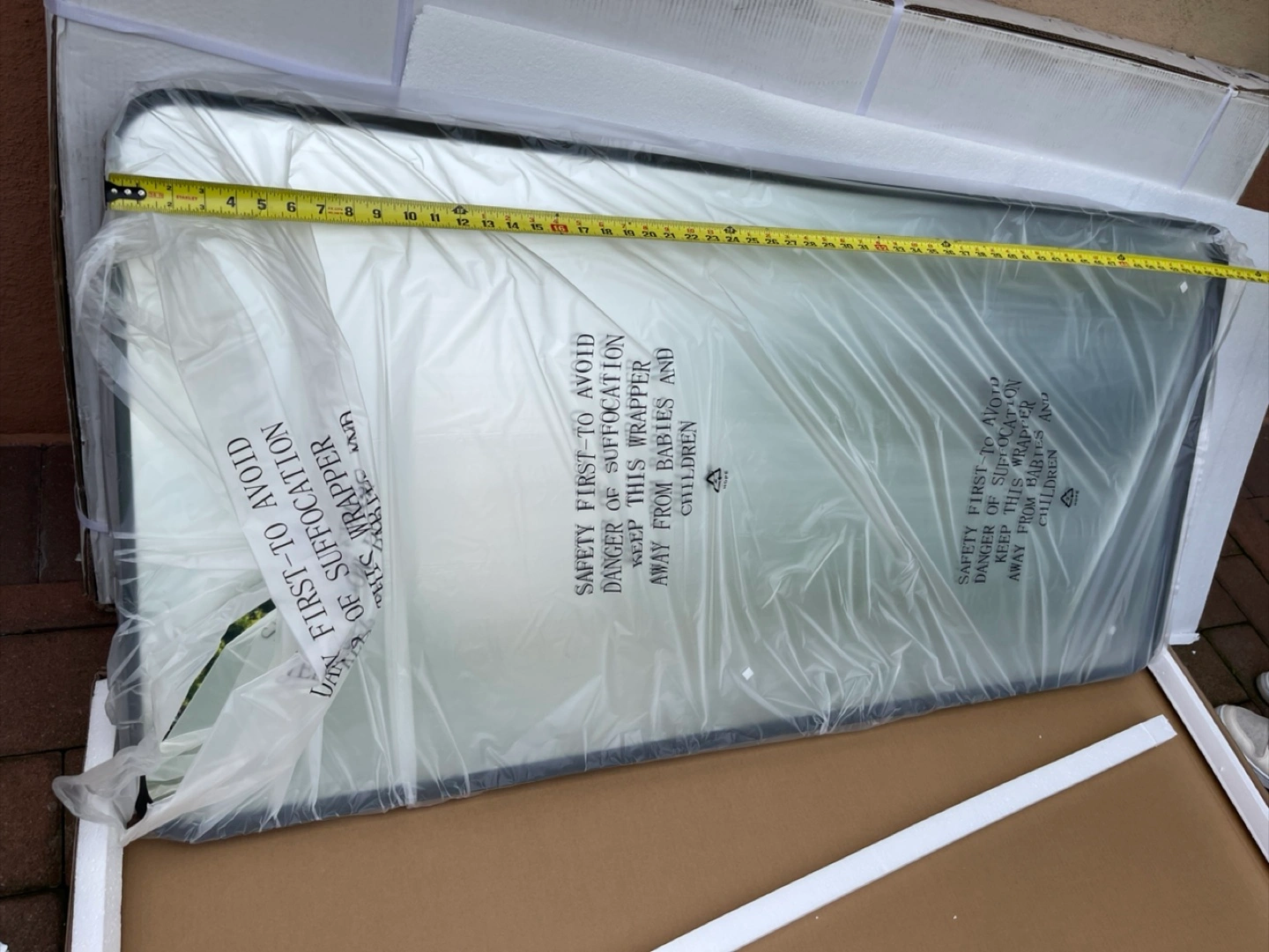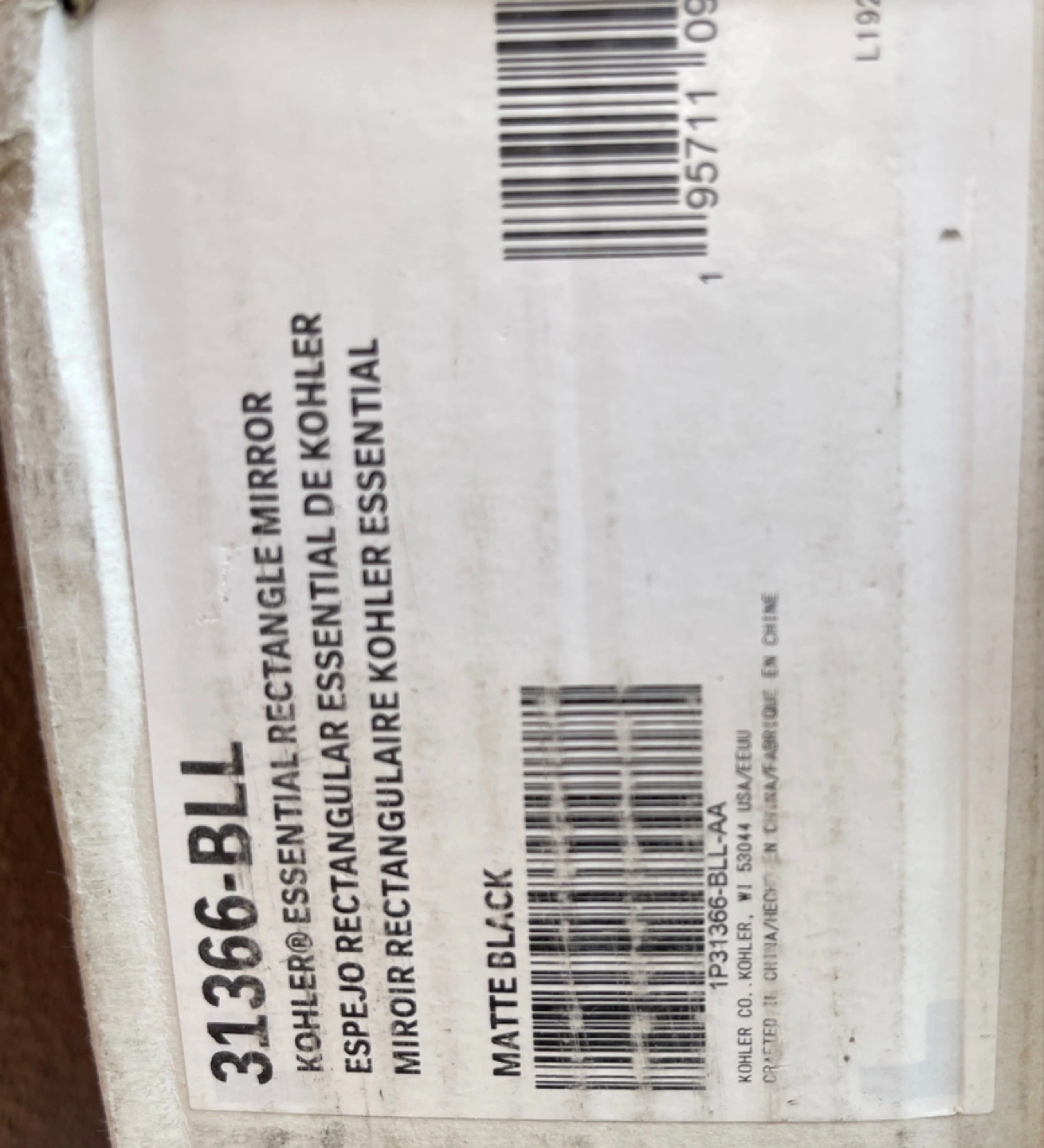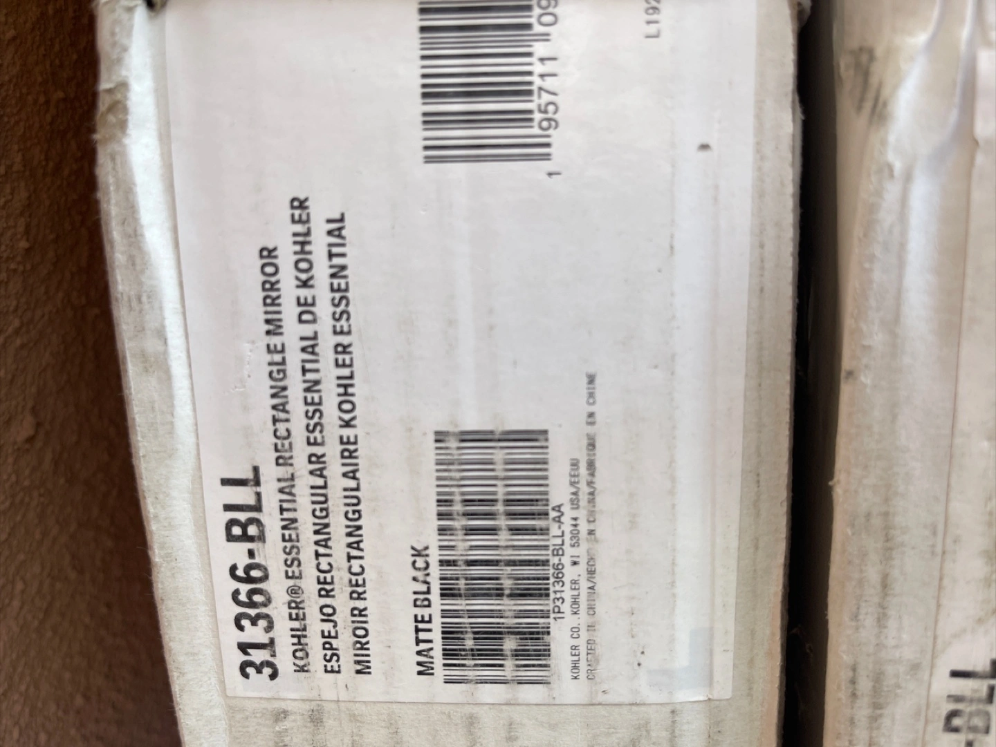 Selling a Custom KOHLER Essential Rectangle Mirror in matte black. It's still in its original packaging and has never been used. The model number is 31366-BLL. It measures approximately 60 inches in length and 30 inches in width.