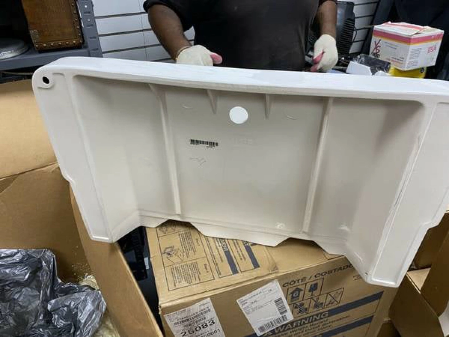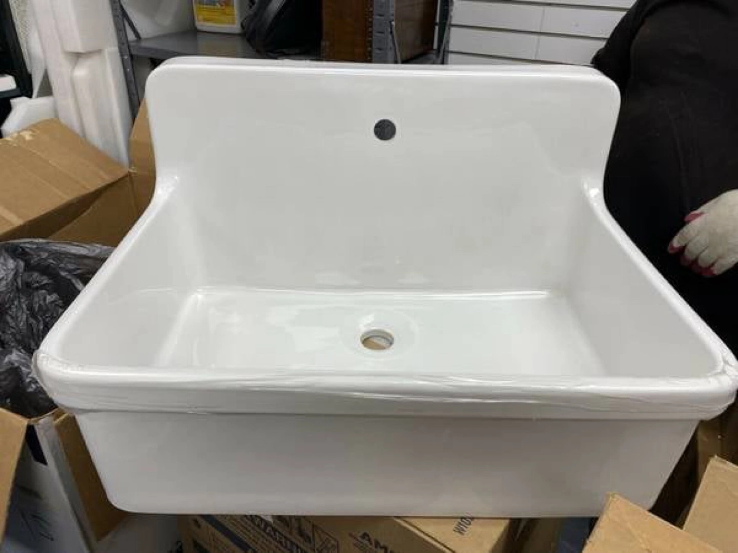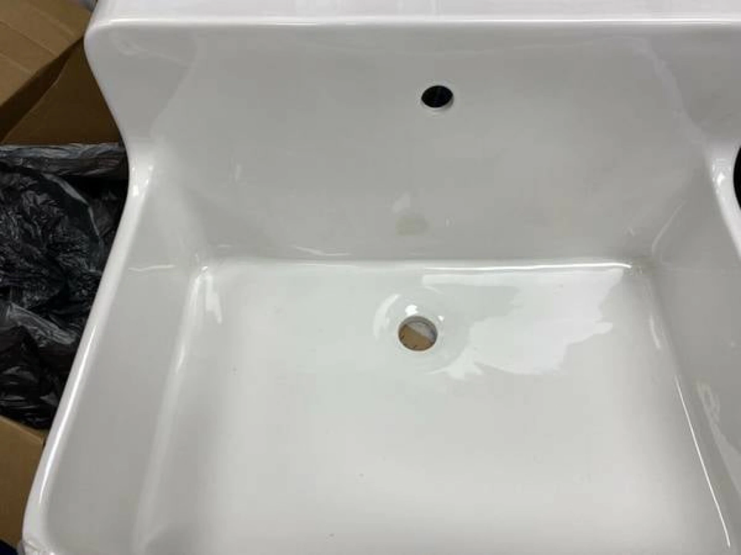 The sink is brand new. White porcelain farmhouse sink. Single faucet hole. Need L brackets for installation if you don’t have kitchen cabinets. Excellent condition.