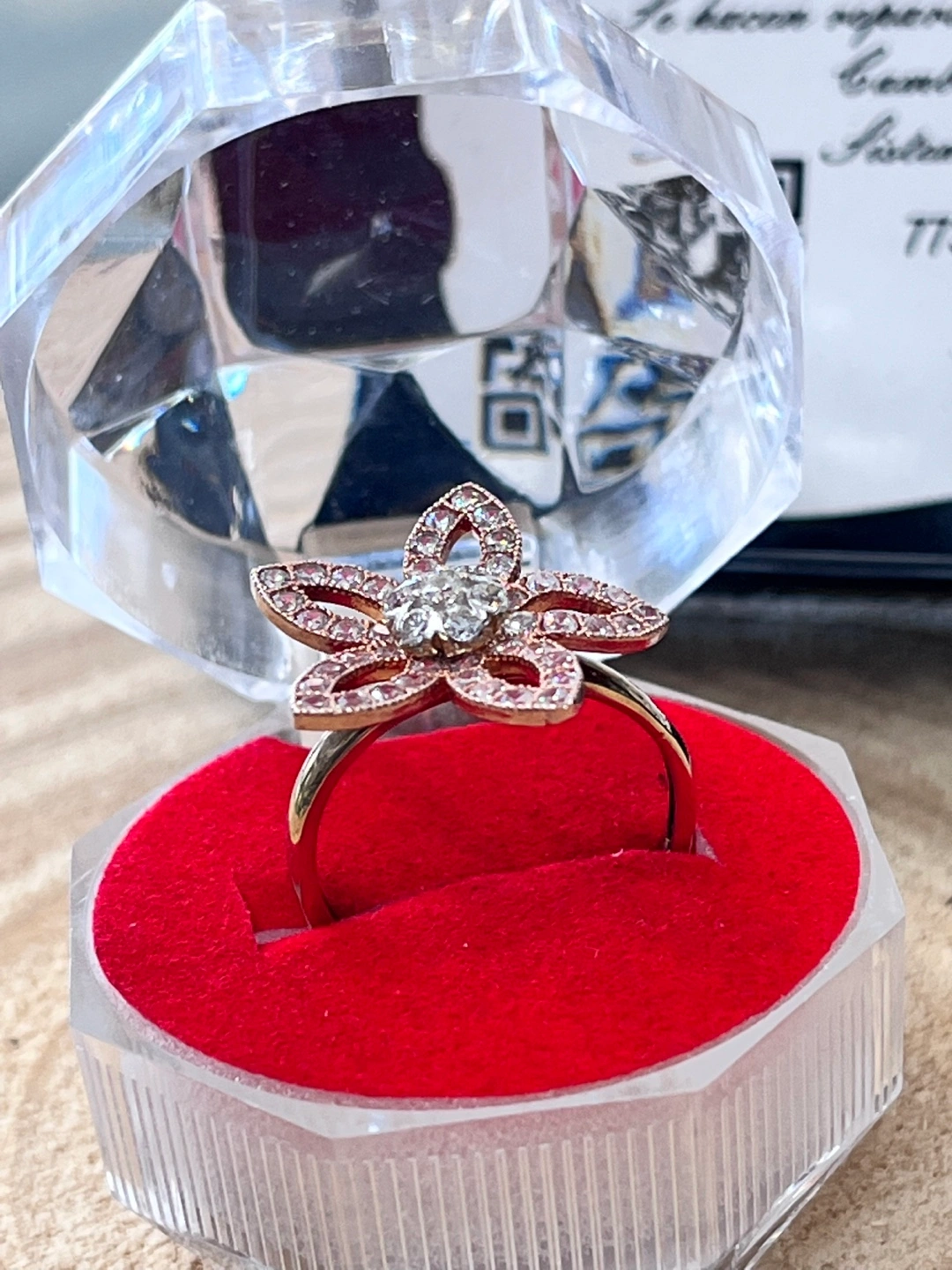 Here's a beautiful flower ring, real gold 14k complete with a display case! It's in great condition and ready for a new Hermoso anillo original 14k para mujer en forma de flor dos oros oro rosa y oro amarillo con pedrería blanca