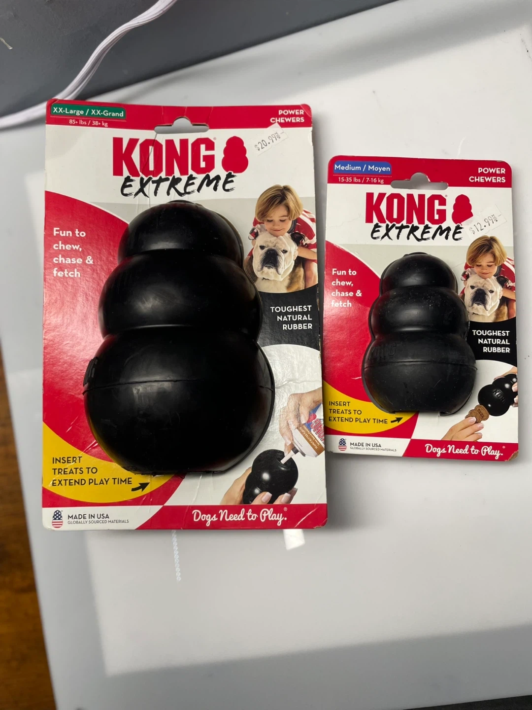 15I have two Kong Extreme dog toys for sale. One is XX-Large (85+ lbs/38+ kg) and the other is Medium (15-35 lbs/7-16 kg). They're made of tough natural rubber and are great for chewing, chasing, and fetching! You can also insert treats to extend play time. Dogs need to play! EACH SOLD SEPARATELY