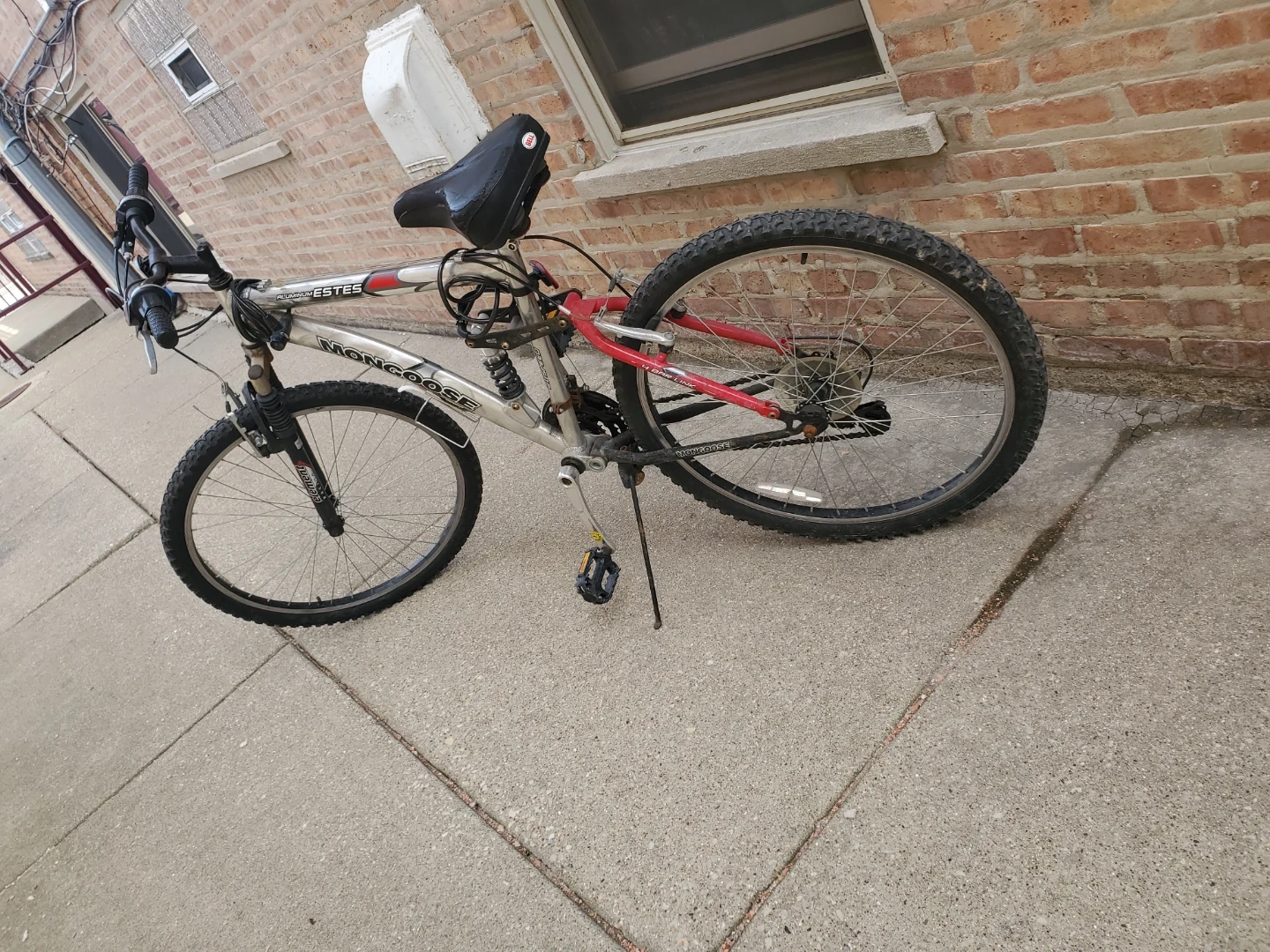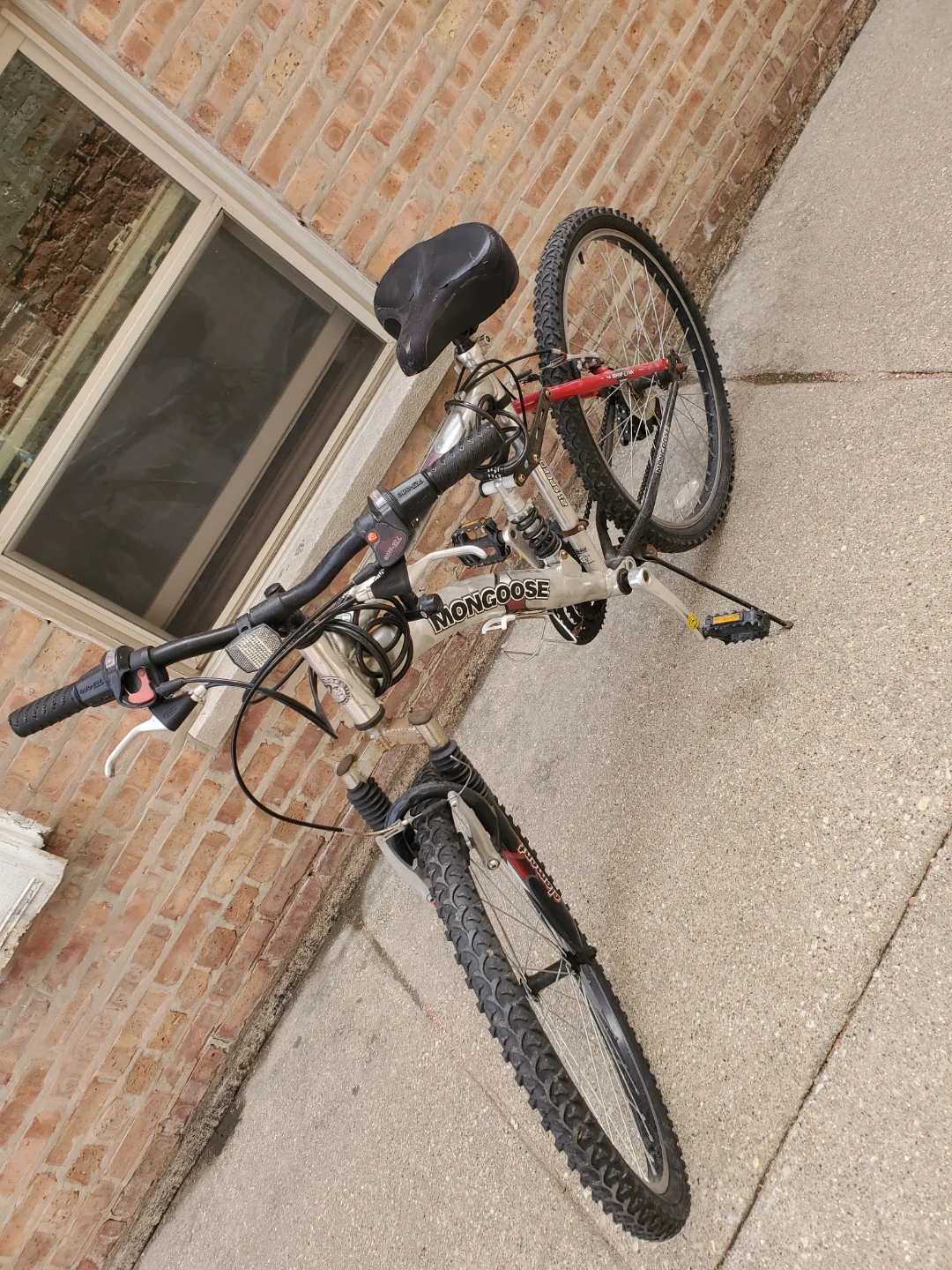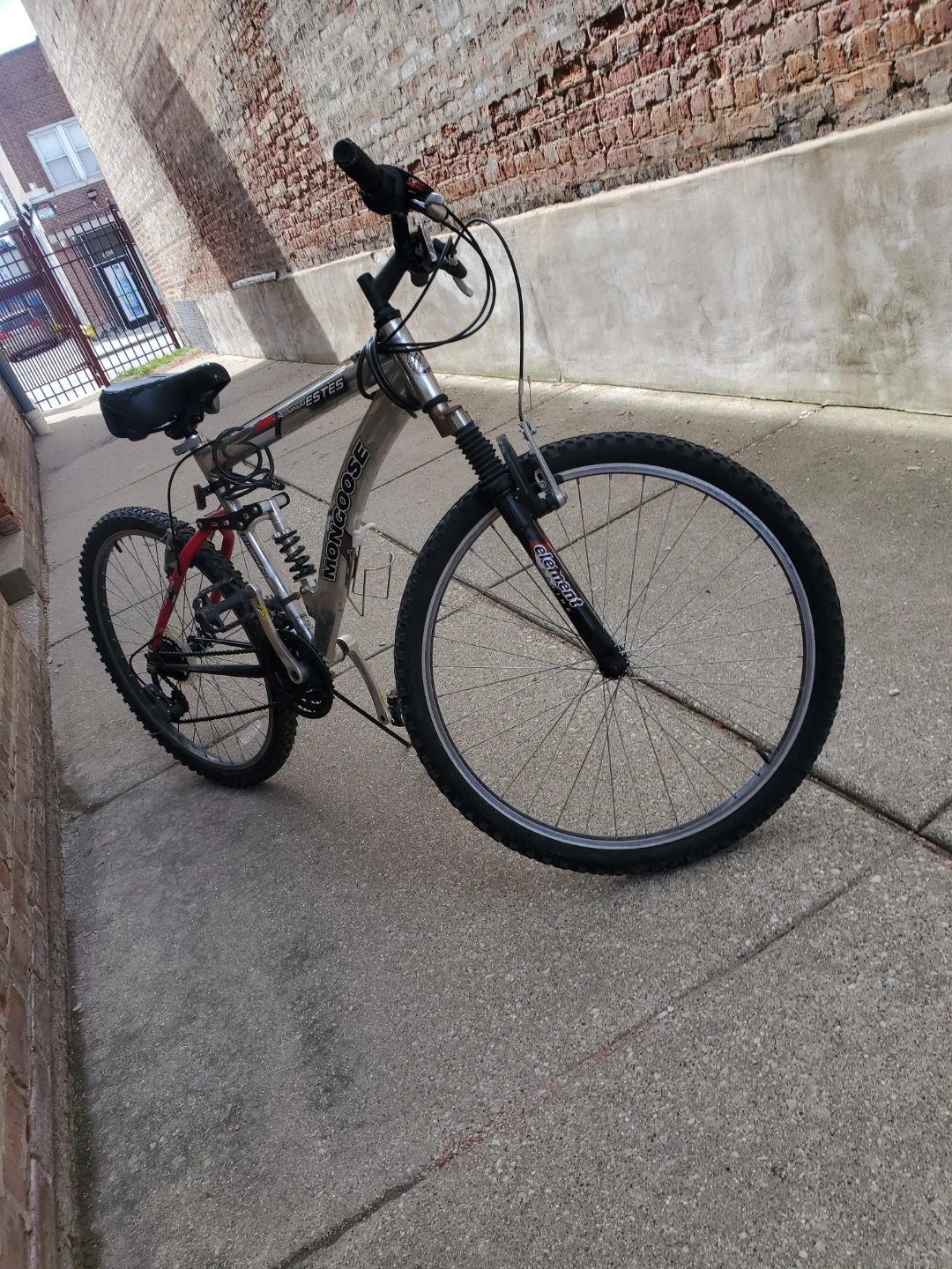 Silver Mongoose Estes mountain bike with front suspension. Features a comfortable padded seat and sturdy frame. This bike's robust build makes it great for trails.