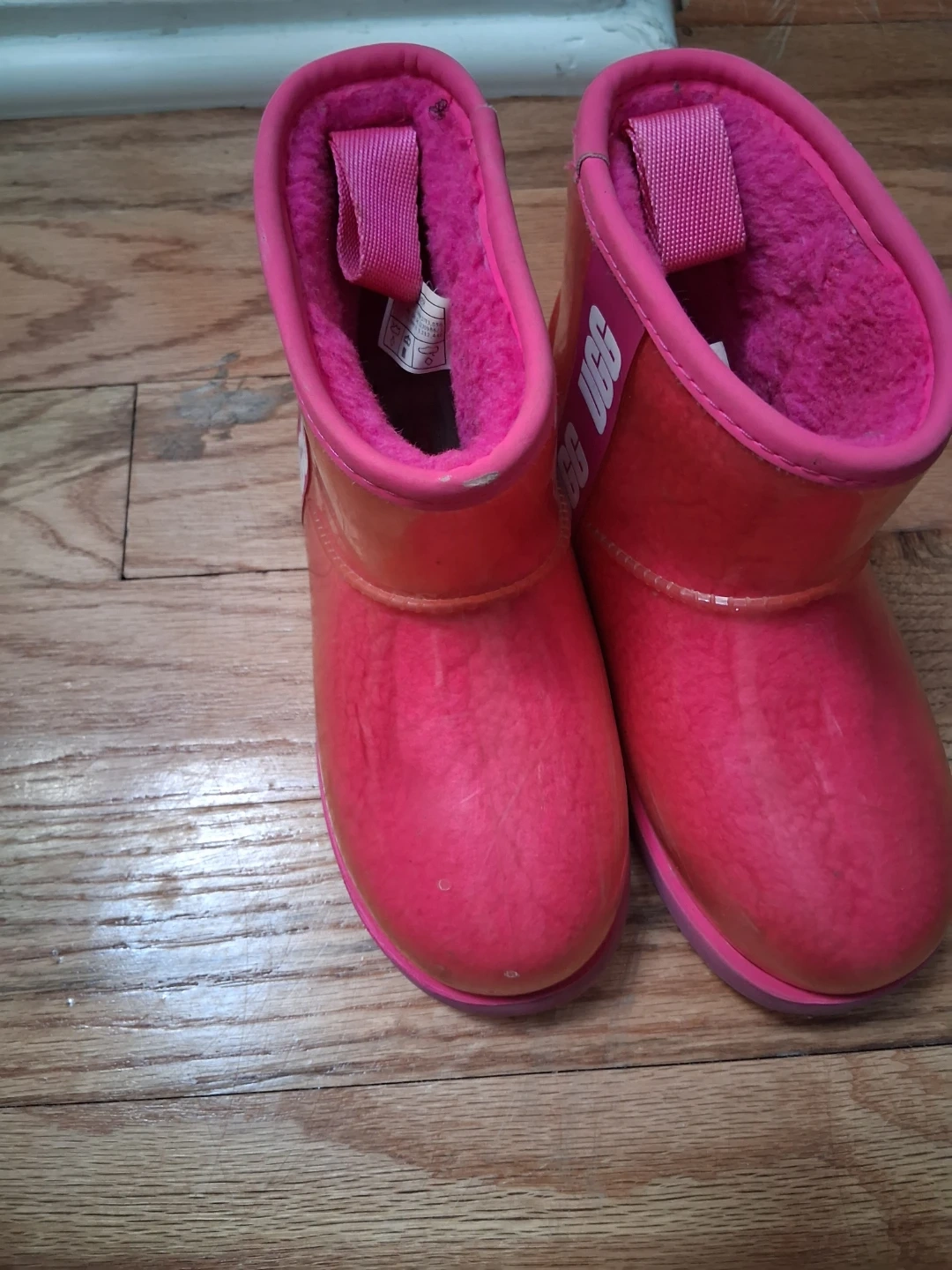 These are pink UGG boots with a clear overlay. They have fuzzy pink lining inside for warmth. Easy pull tabs on each boot.