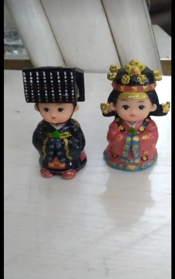 Here are two small figurines of a man and woman in traditional Korean clothing. They would make a great addition to any collection or as a decoration!