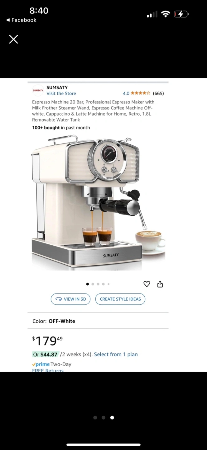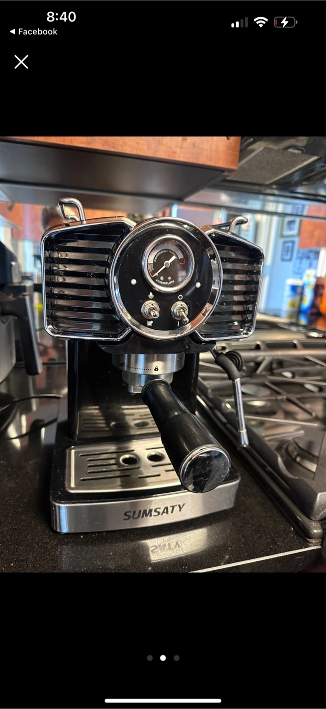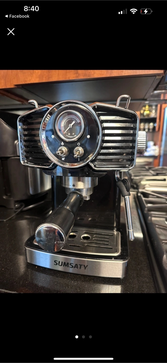 Selling a Sumsaty Espresso Machine, 20 Bar. It's a professional espresso maker with a milk frother steamer wand. Perfect for making cappuccino and latte at home. It has a 1.8L removable water tank.
