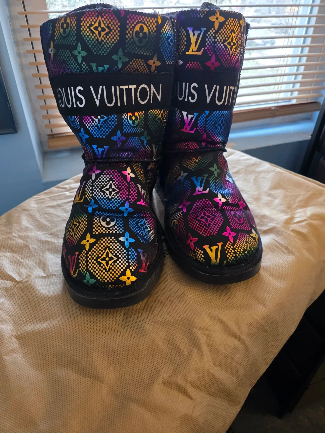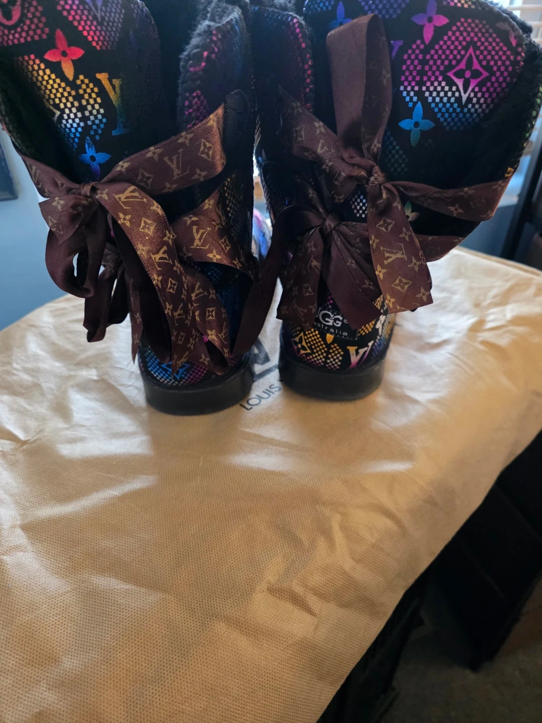 Stylish Louis Vuitton and UGG collaboration boots! These boots feature a colorful monogram pattern and ribbon detail. Perfect for adding a touch of luxury to your winter wardrobe
