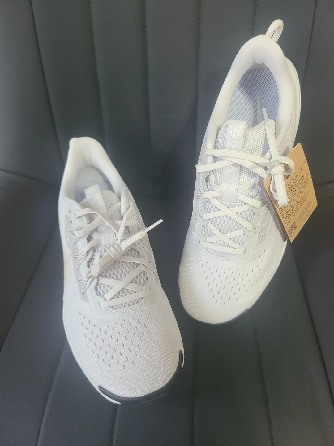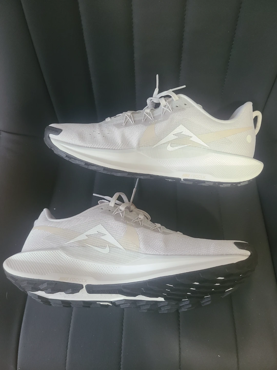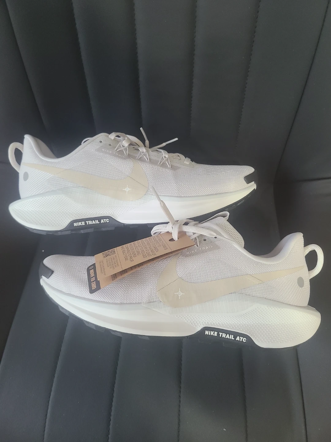 These are Nike Pegasus Trail 5 running shoes. They're white with a light beige swoosh. The shoes are made of mesh material and feature a durable rubber outsole. Men's size 10.5 US