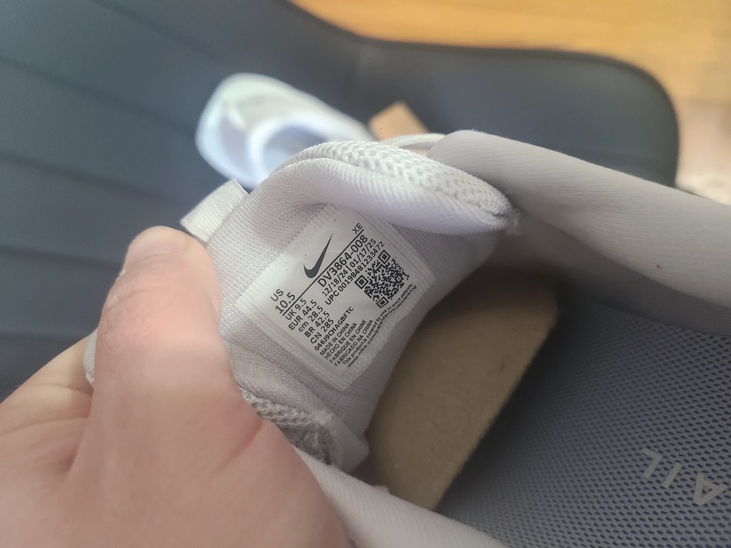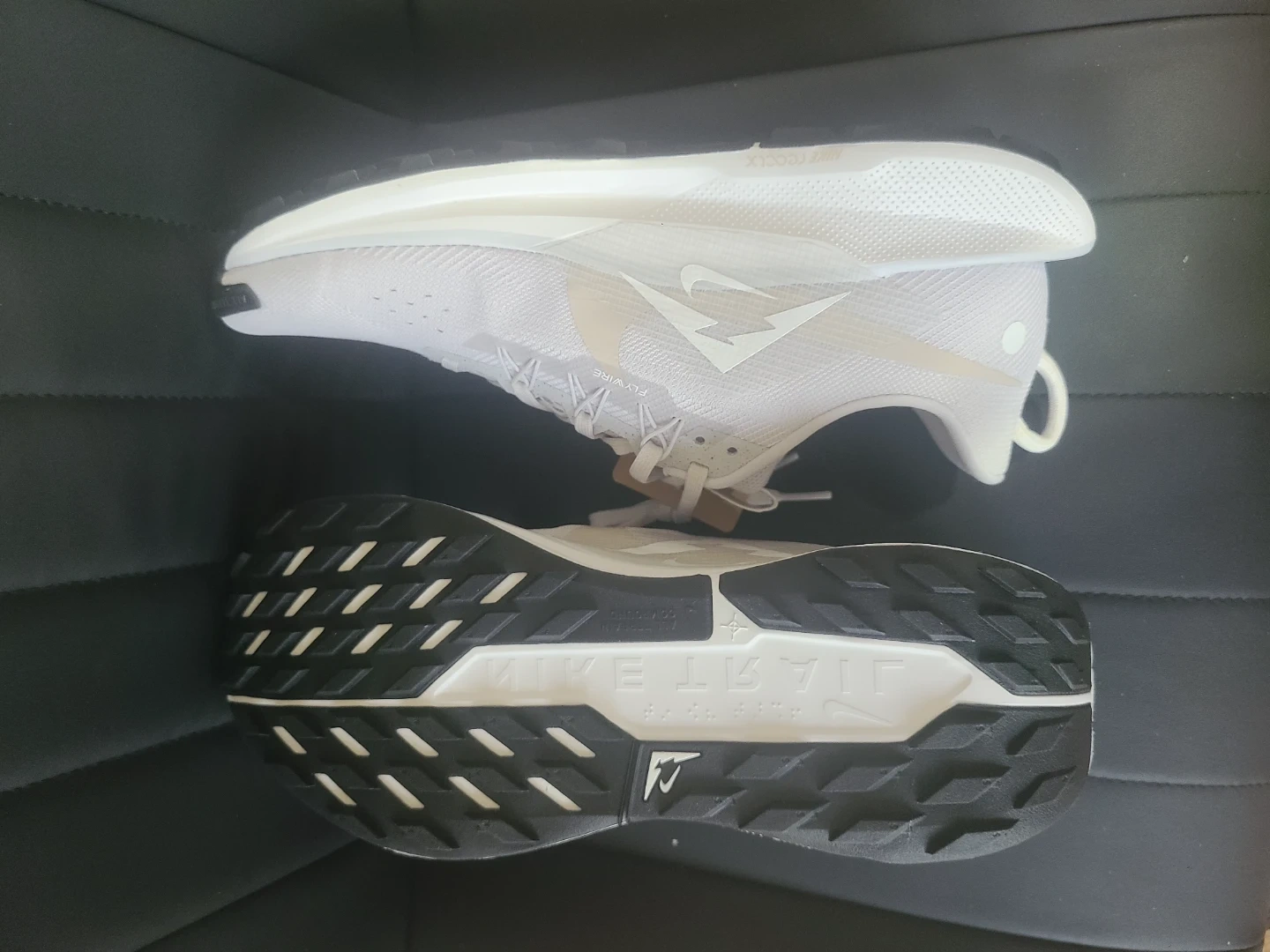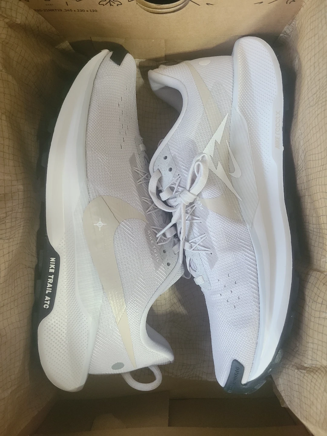 These are Nike Pegasus Trail 5 running shoes. They're white with a light beige swoosh. The shoes are made of mesh material and feature a durable rubber outsole. Men's size 10.5 US