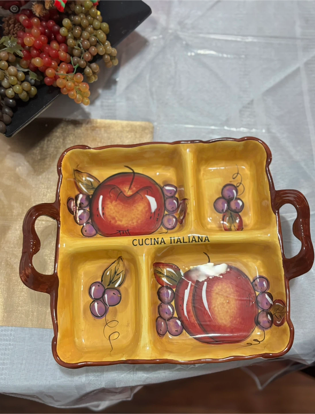 Offering a lovely Cucina Italiana divided serving dish. It features a charming design with apples and grapes on a yellow background. Perfect for serving snacks or appetizers at your next gathering!