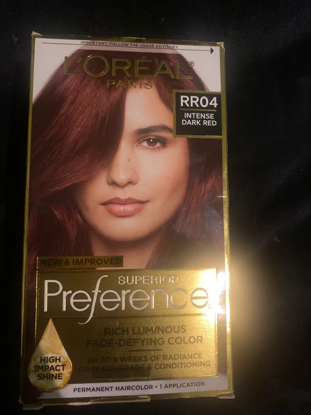 Get rich, luminous, fade-defying color with L'Oreal Superior Preference! This permanent hair color provides up to 9 weeks of radiance and is suitable for all hair types, even those with gray coverage needs. The Shine Protect Conditioner, infused with a UV filter and Vitamin E, helps keep first-day color vibrancy and provides silky, resilient hair for high impact shine. This is in the shade RR04 Intense Dark Red
