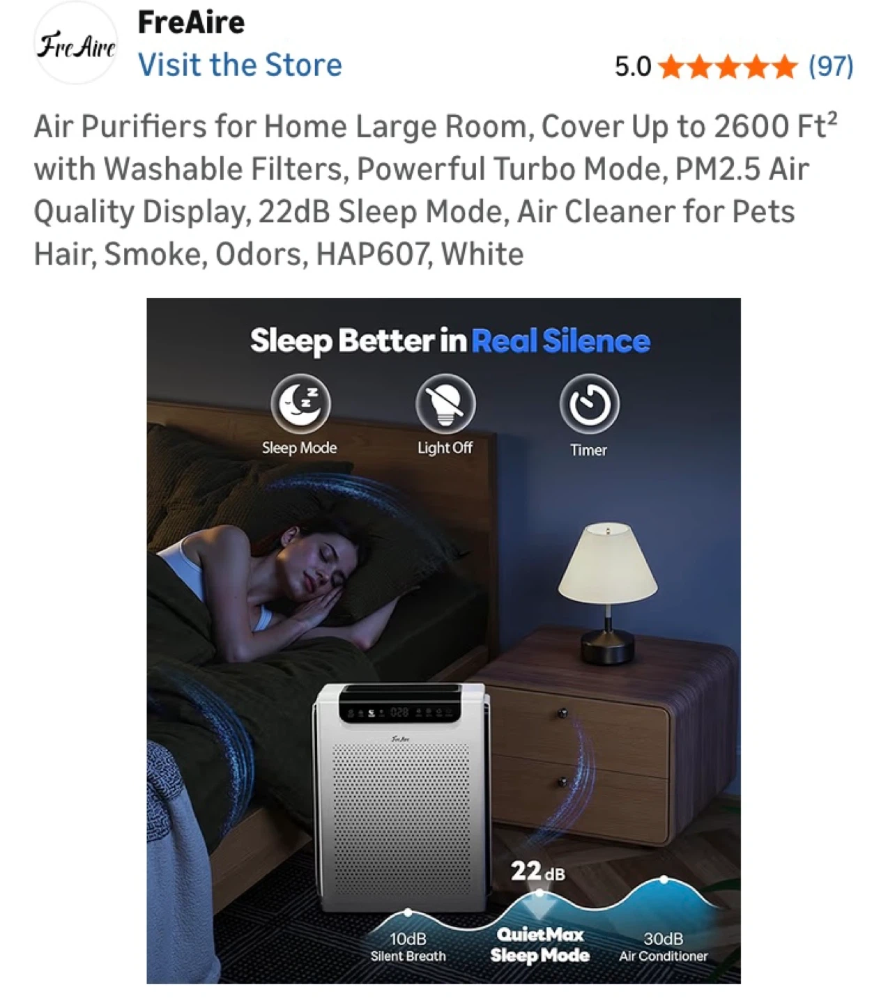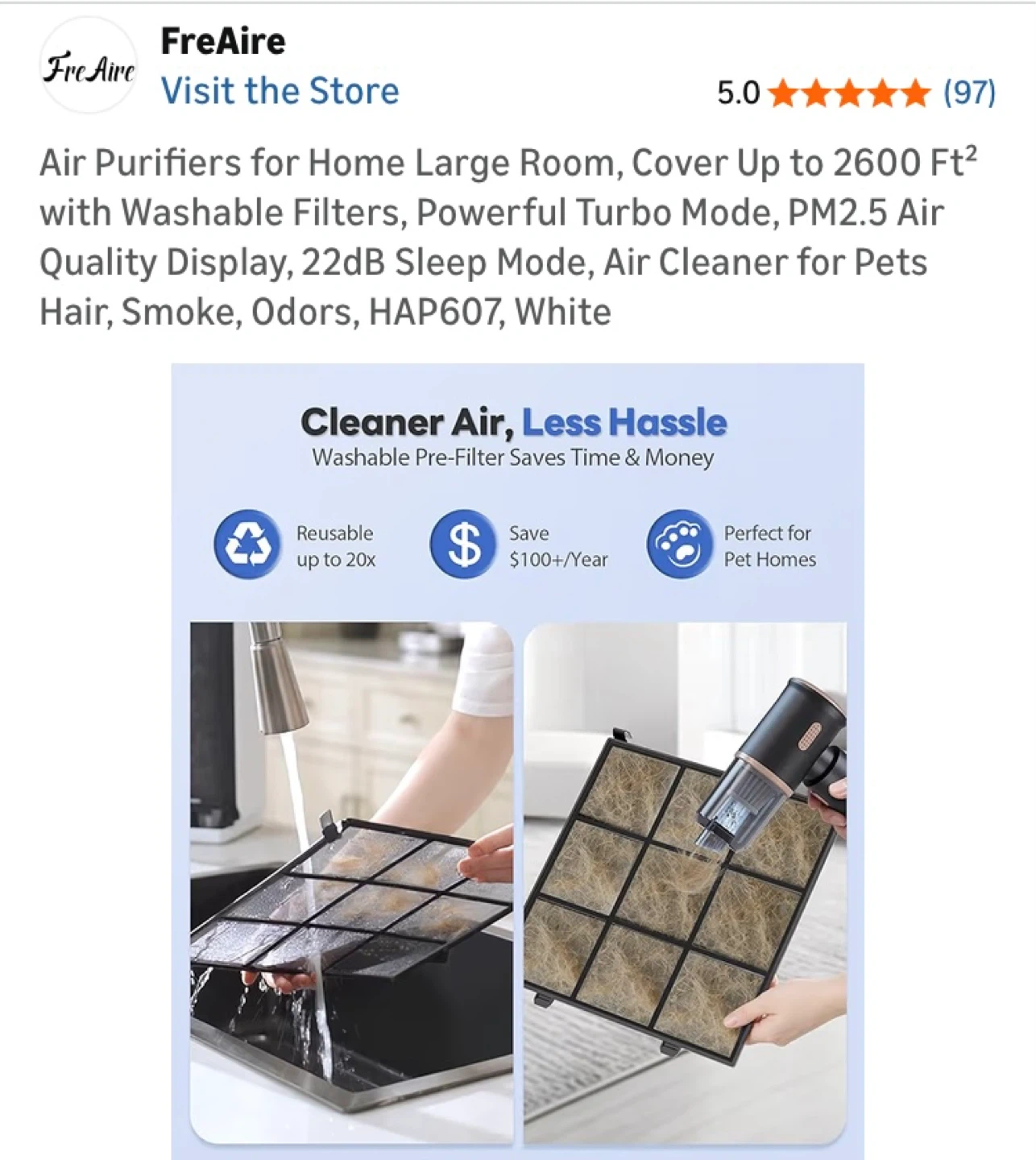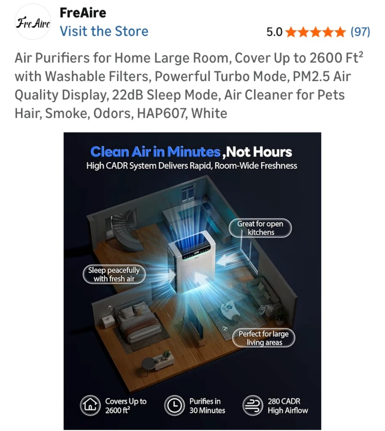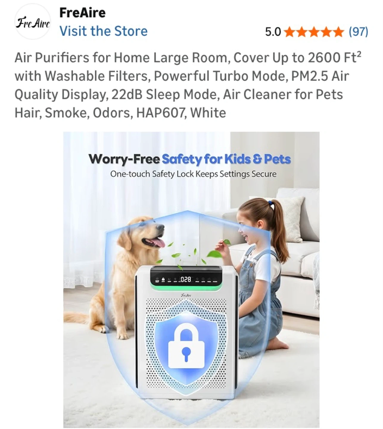 FreAire HAP607 air purifier. Covers up to 2600 sq ft. Features a washable filter, PM2.5 air quality display, and 22dB sleep mode. Great for large rooms and pet owners!