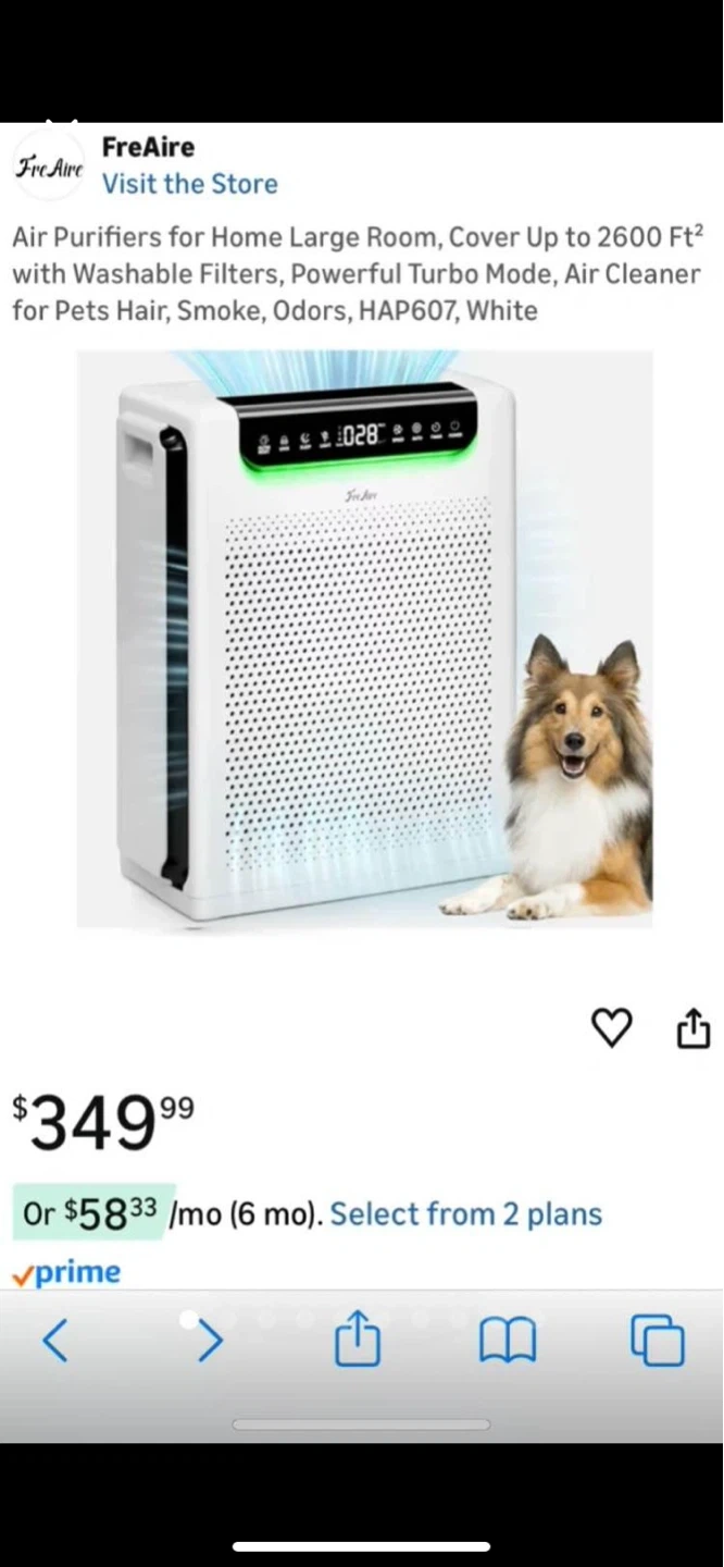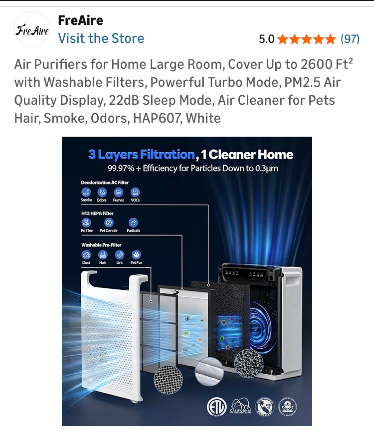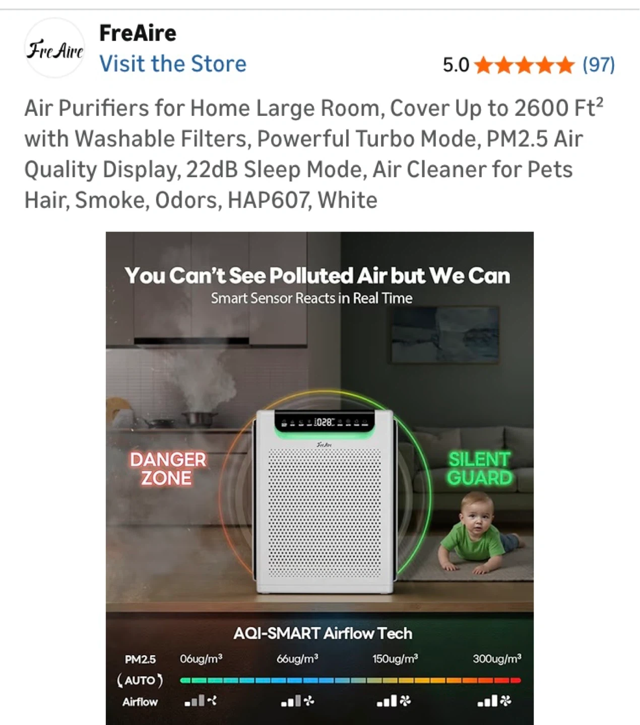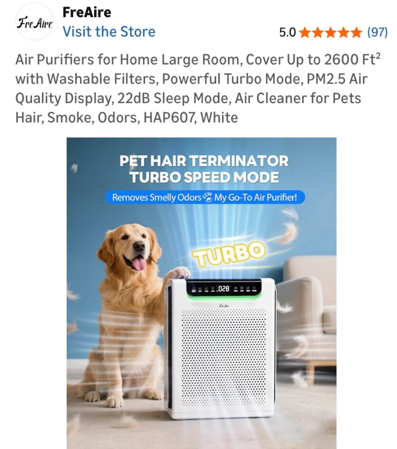 FreAire HAP607 air purifier. Covers up to 2600 sq ft. Features a washable filter, PM2.5 air quality display, and 22dB sleep mode. Great for large rooms and pet owners!