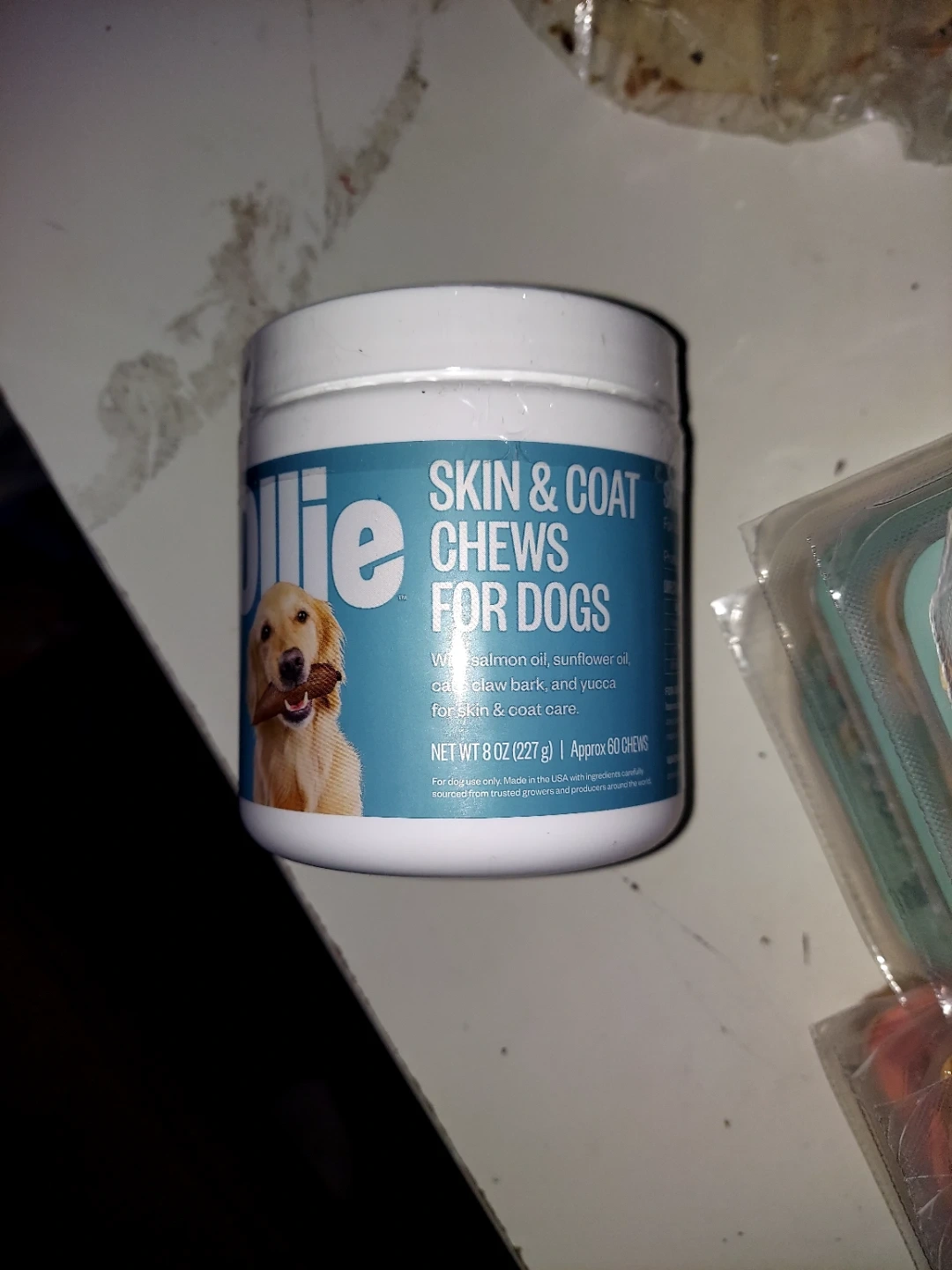 Selling a container of Ollie Skin & Coat Chews for Dogs. These chews contain salmon oil, sunflower oil, cat's claw bark, and yucca for skin and coat care. The container has a net weight of 8 oz (227 g) and contains approximately 60 chews