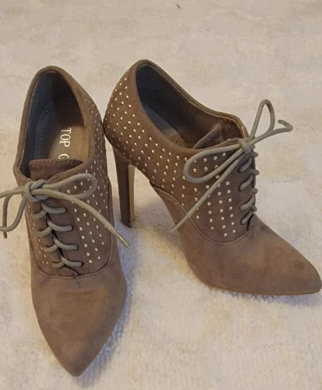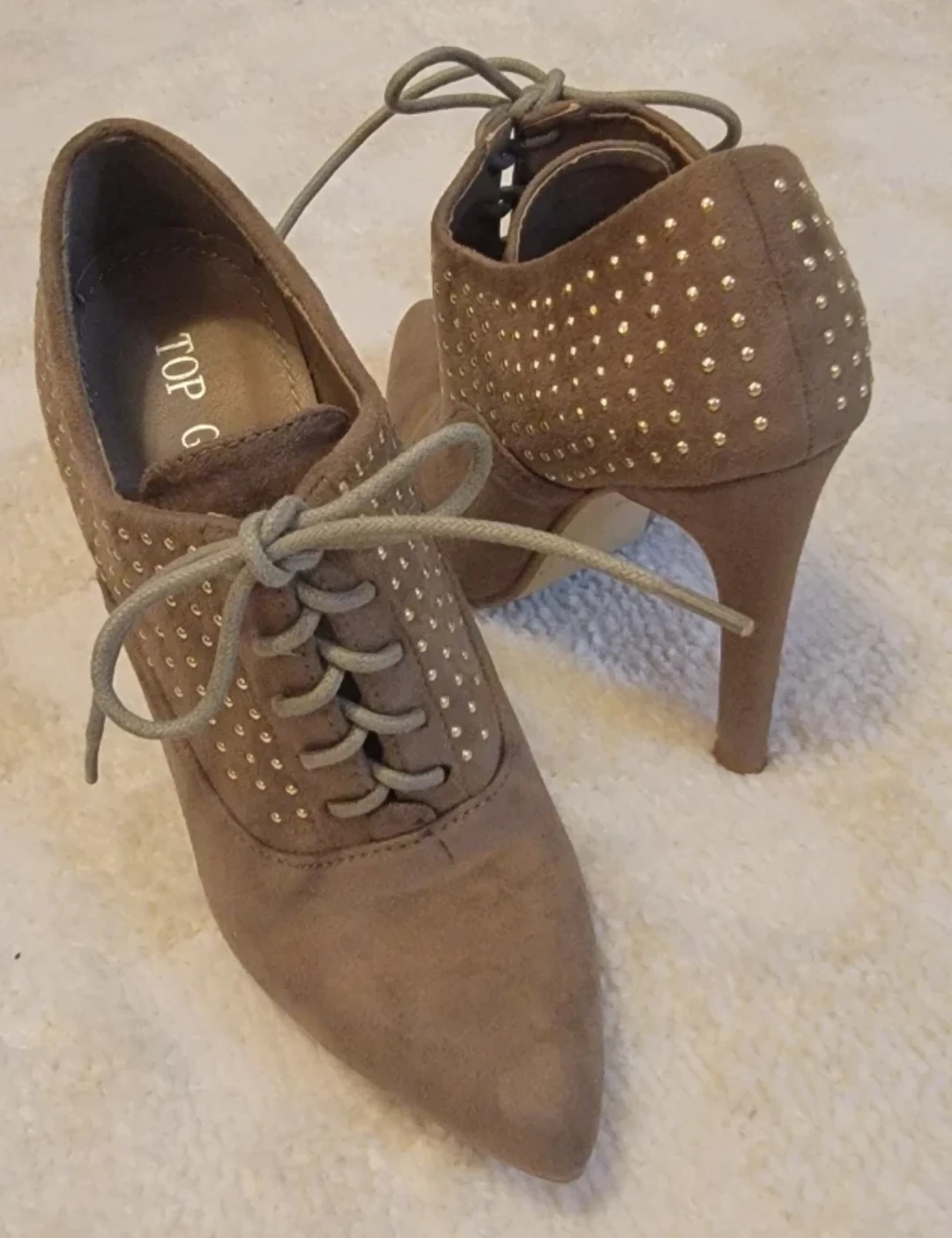 These taupe ankle boots feature a stylish studded design and lace-up front. The faux suede material adds a touch of sophistication. A comfortable heel height makes them suitable for various occasions. 3.9 inch