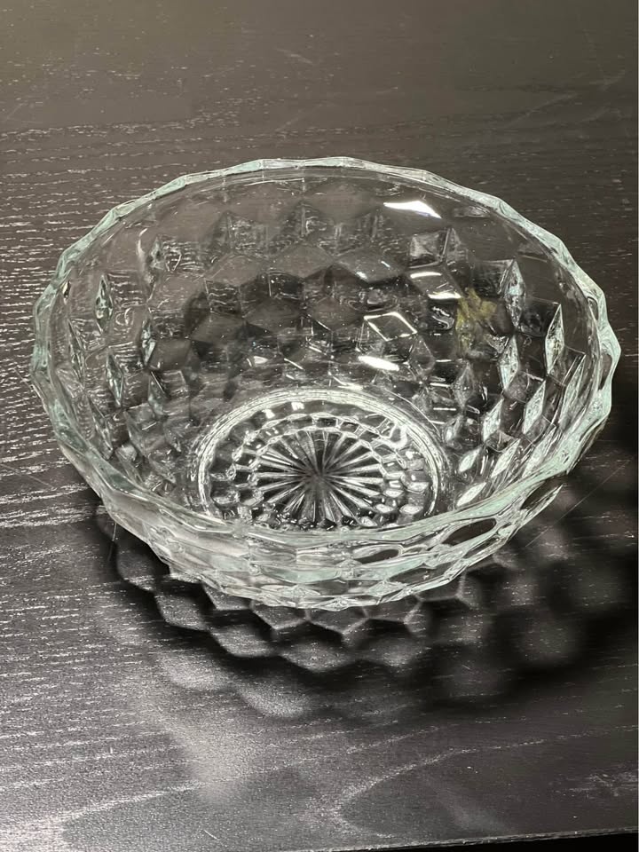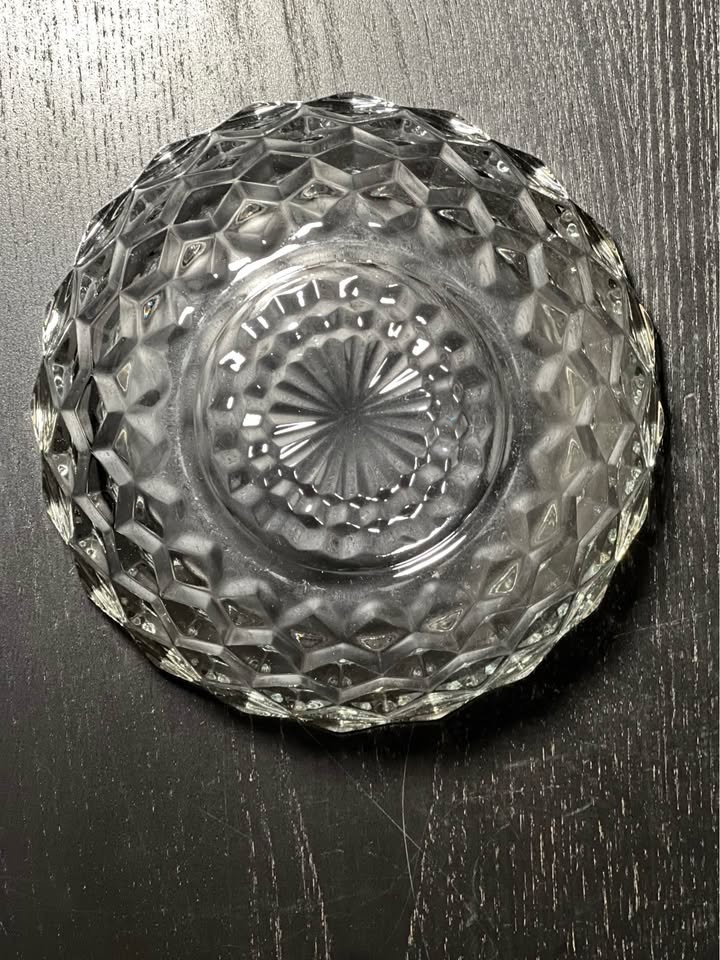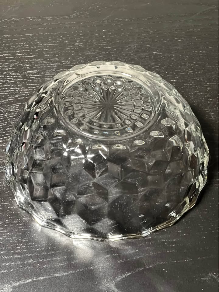 This is a beautiful clear glass bowl from Fostoria American glassware, featuring their distinctive three-dimensional cubist or diamond geometric design. This pattern, often called "American," "Cubist," or "Cube" (Stem #2056), was first produced by Fostoria Glass Company around 1915 and was made for many years. This 6.5-inch diameter piece is commonly used as a candy or nut dish. It's made of pressed clear crystal, which has a nice weight to it and catches the light wonderfully with its angular facets. Pre-owned. Pickup is at 58th and 7th Ave in Midtown Manhattan.