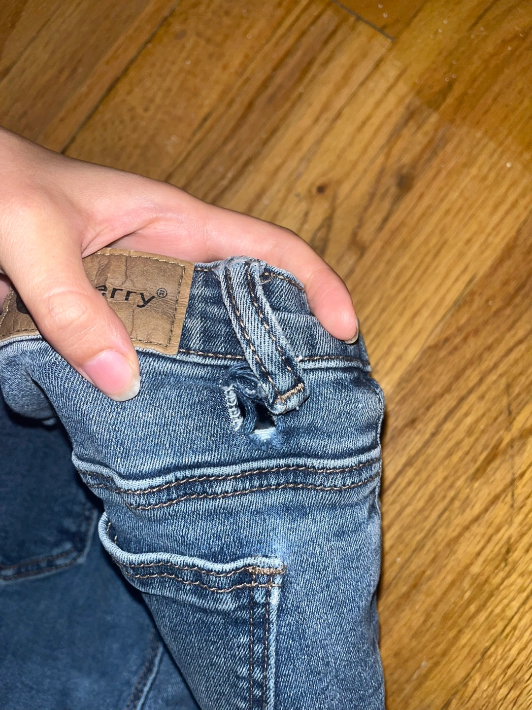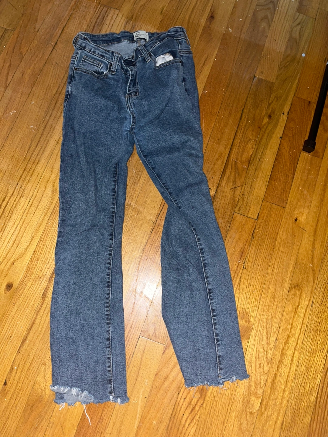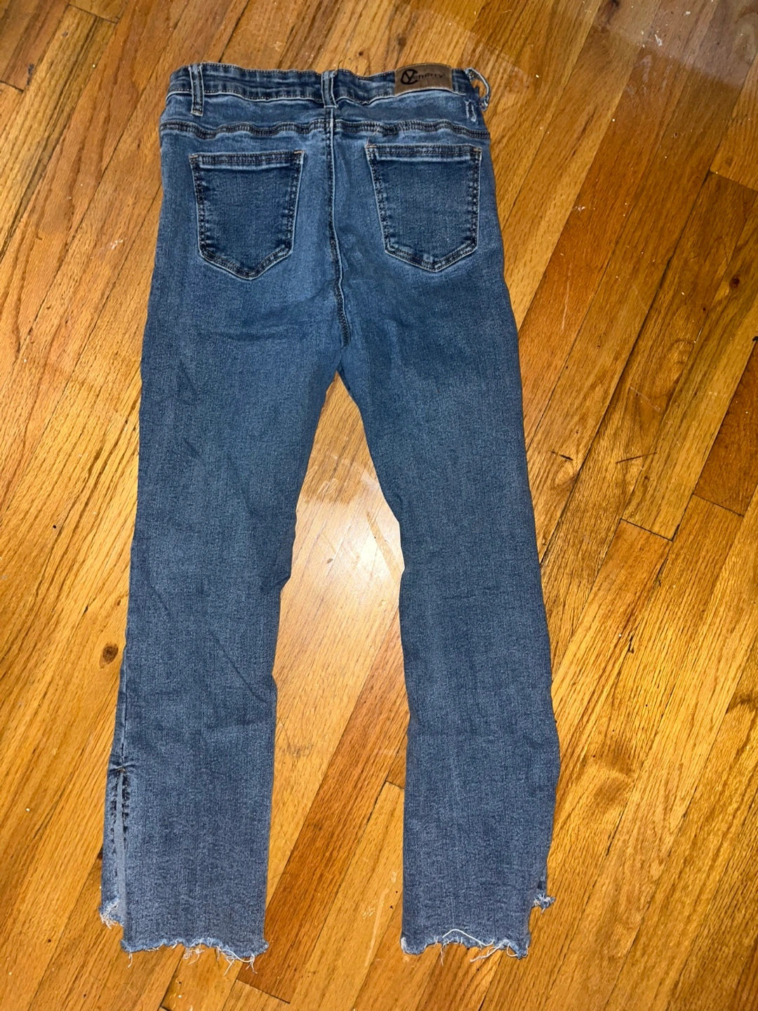 Giving away a pair of jeans that I loved! There is a slight patch needed in the back (see third photo) but otherwise in great condition. Has a slight flare and is around ankle length, super stylish with white tees and more! Would love to find a new owner for it :)
