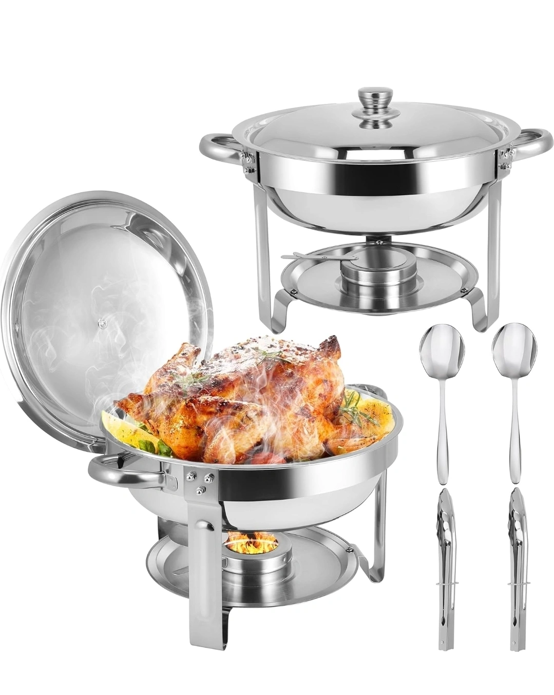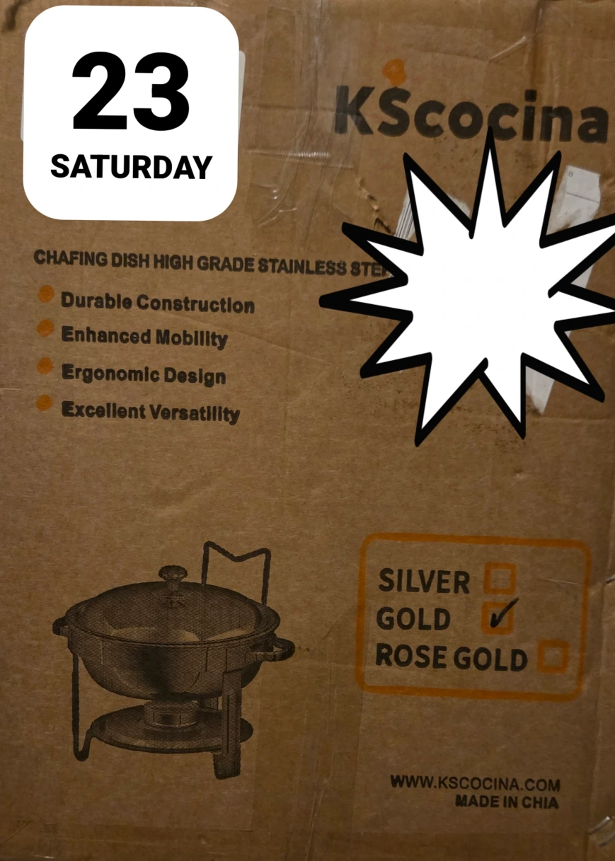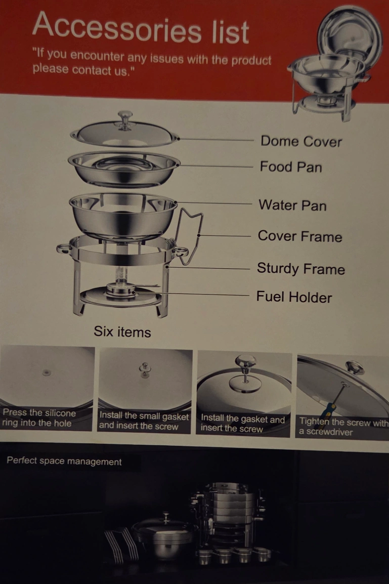 Selling a KScocina chafing dish made of high-grade stainless steel! It has a durable construction, enhanced mobility, ergonomic design, and excellent versatility. It comes with a dome cover, food pan, water pan, cover frame, sturdy frame, and fuel holder.