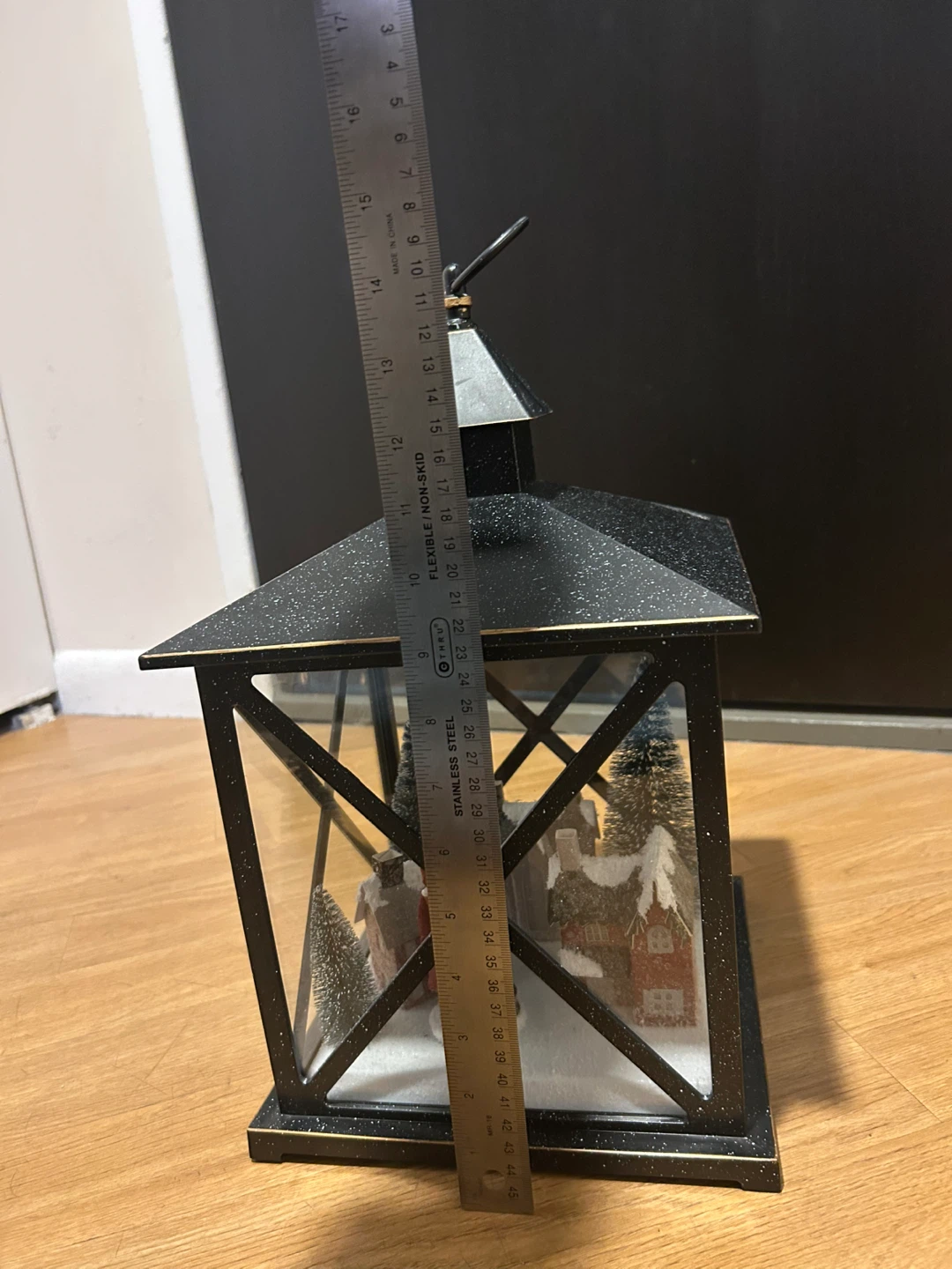 Selling a charming black Christmas village lantern! It's in great condition and creates a cozy holiday atmosphere. The lantern features a detailed miniature village scene inside, complete with snow-covered houses and trees. It measures approximately 15 inches in height and 9 inches in width, making it a lovely centerpiece or accent piece for your holiday decor. Works! Takes AAA batteries.
