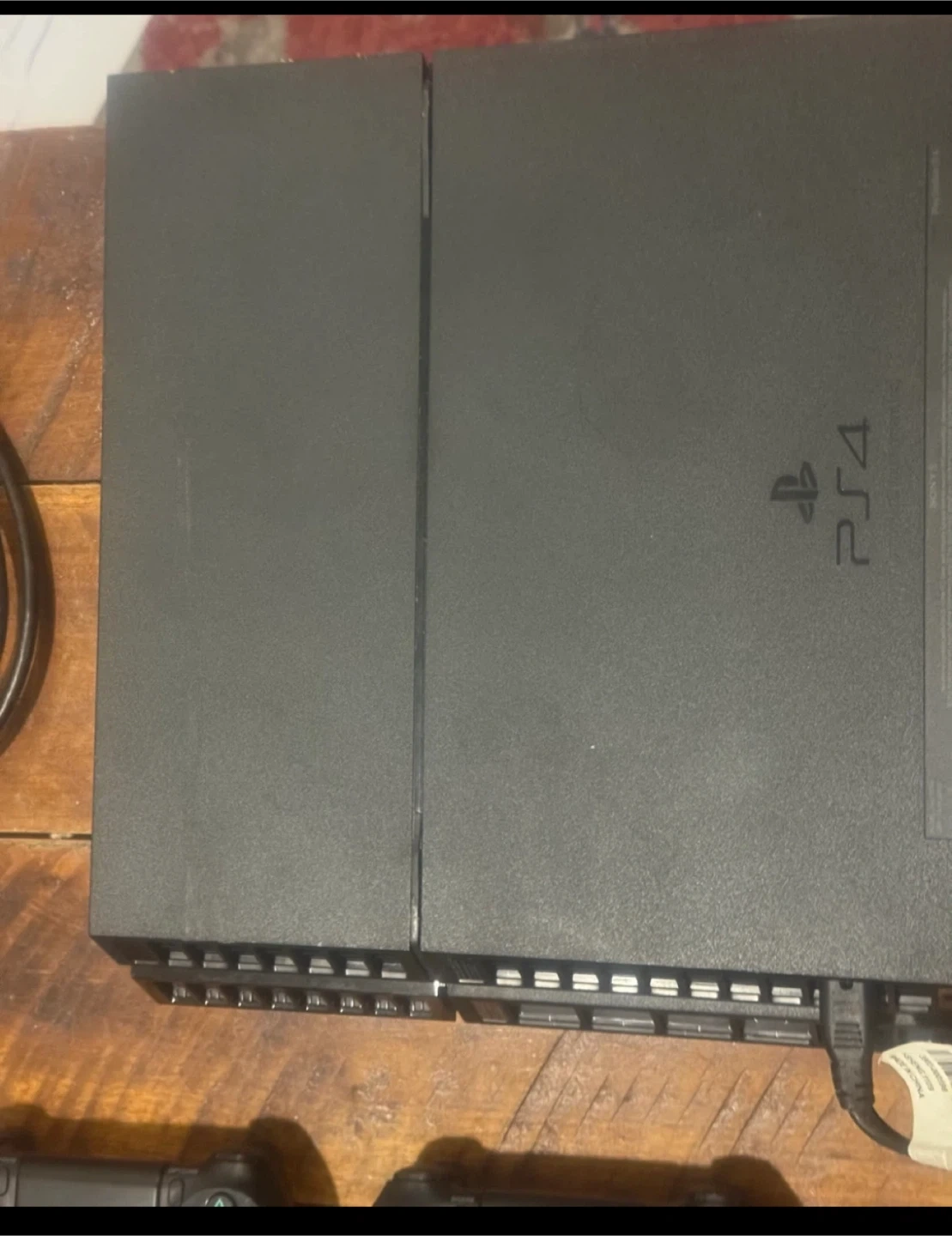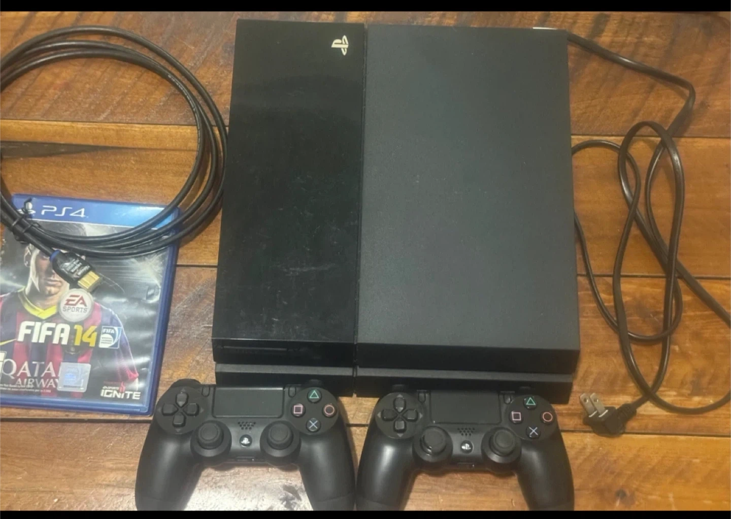 Selling a used PlayStation 4 (PS4) console. It comes with two controllers, a power cable, and the game FIFA 14. Great for gaming!