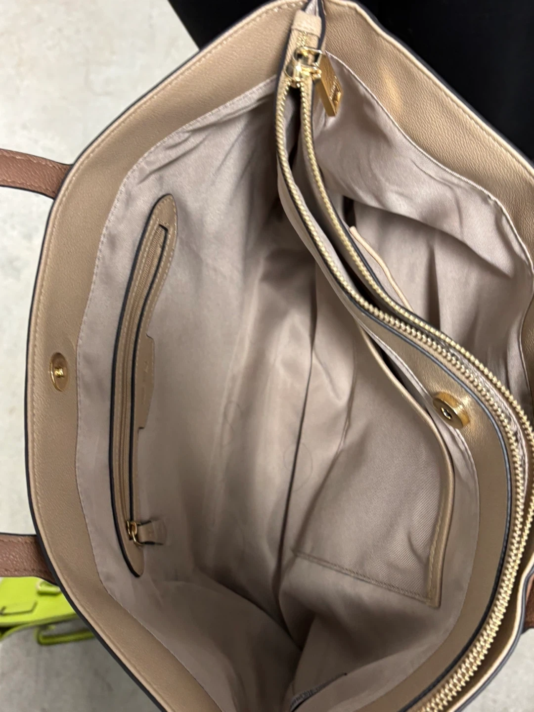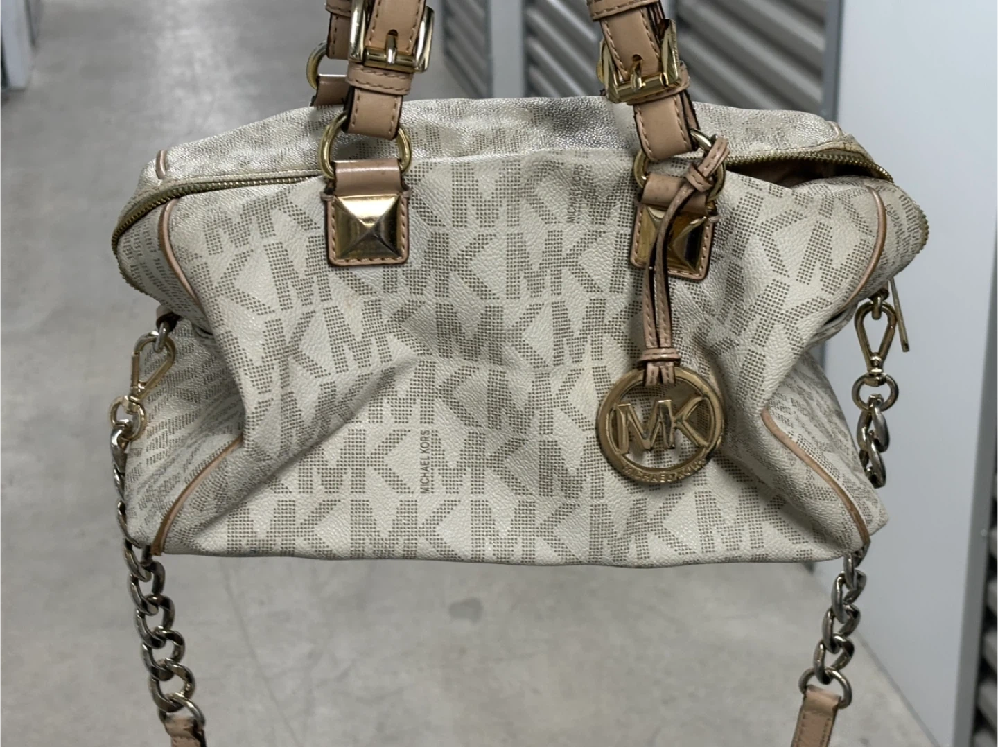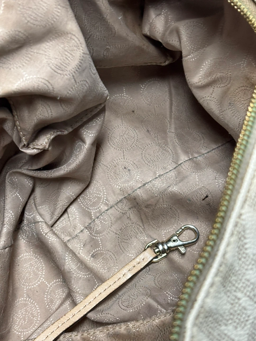 This is a Michael Kors satchel handbag featuring the brand's signature monogram pattern. It has a neutral-toned interior with zippered pockets and compartments for organization. The exterior is made of coated canvas with leather trim and gold-tone hardware.