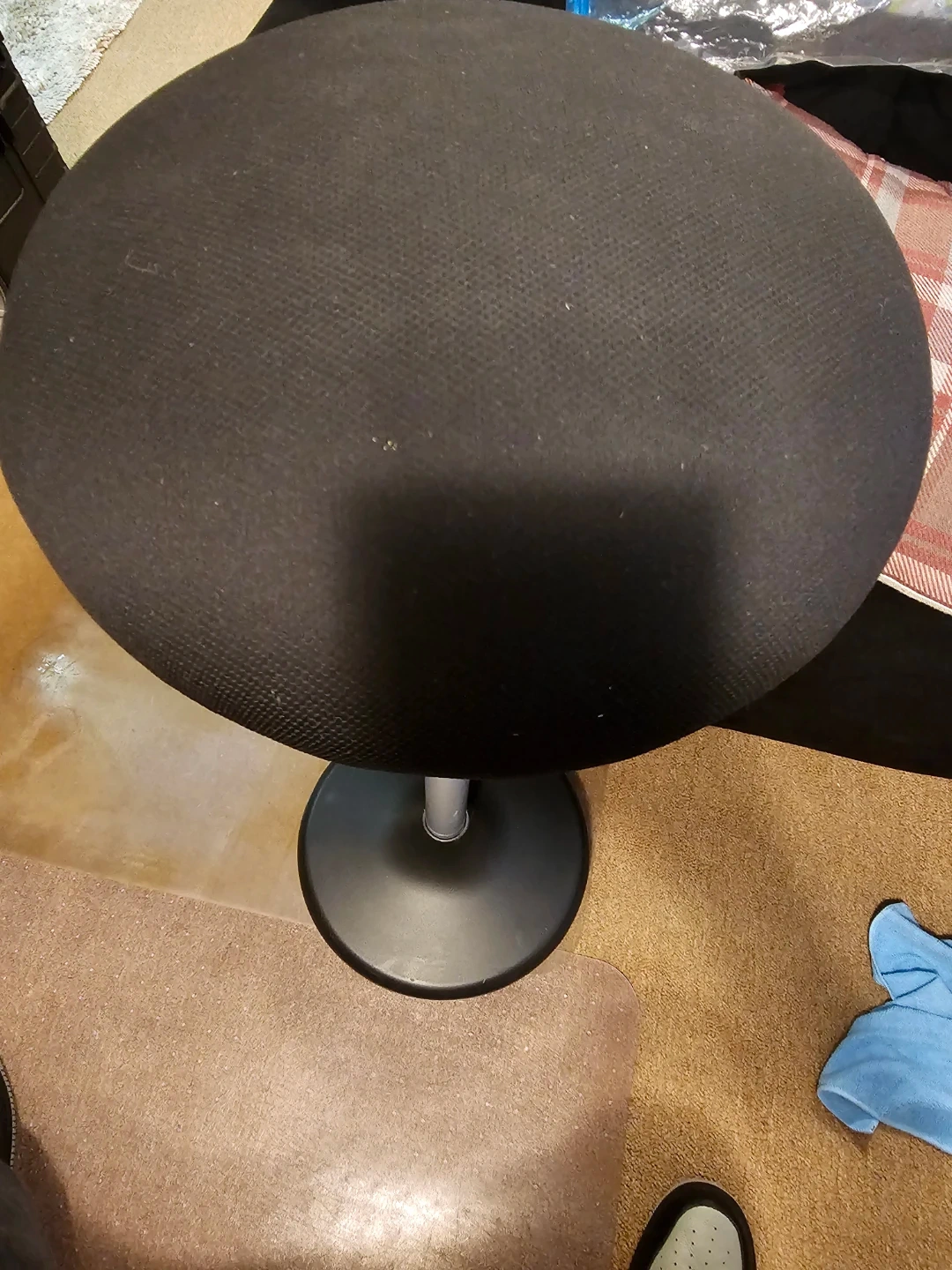 Uplift Desk Motion Stool. Black fabric upholstery. Adjustable height. Motion Stool - comfortable seat, base is rounded to work your core while you are sitting.