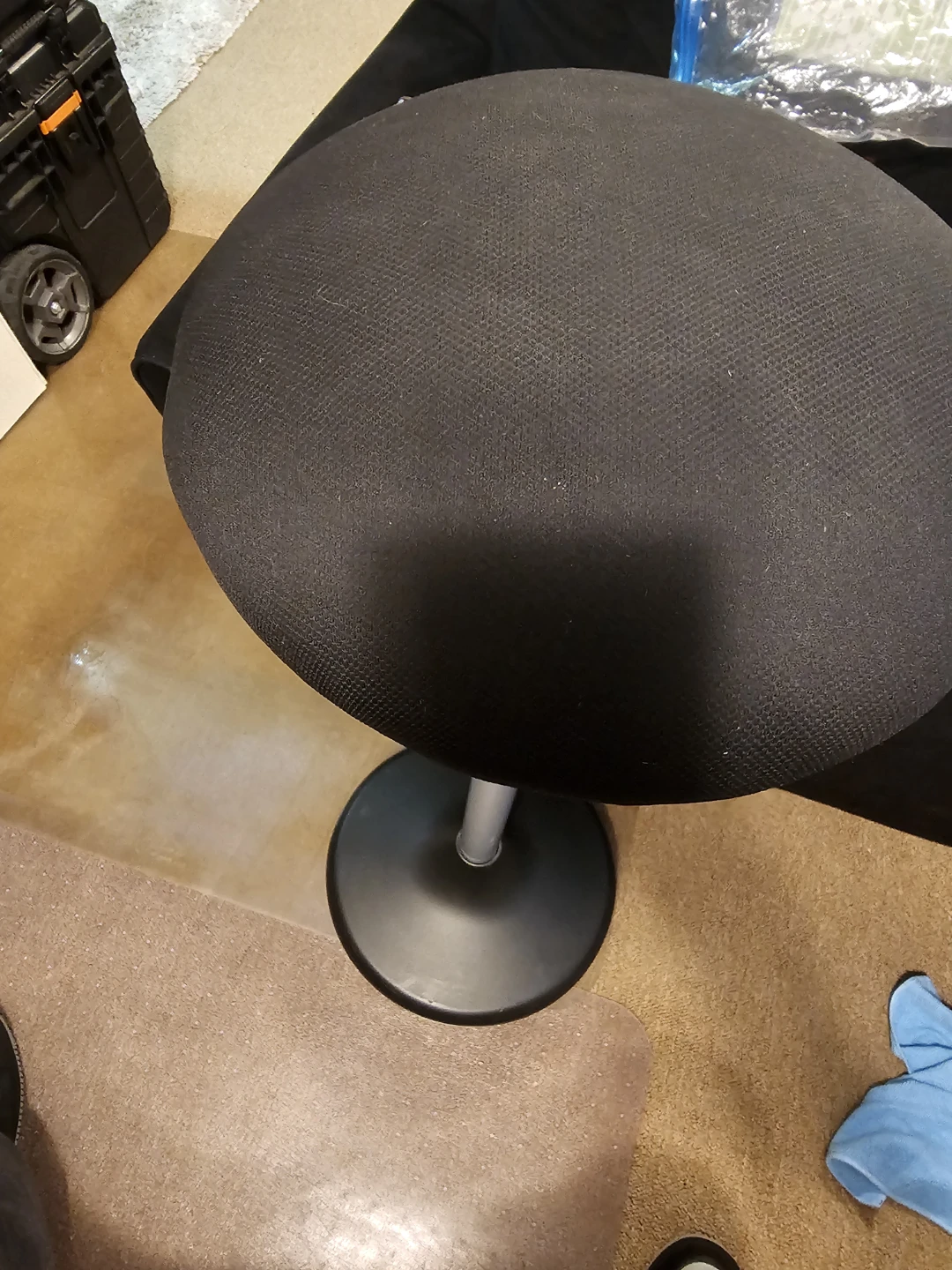 Uplift Desk Motion Stool. Black fabric upholstery. Adjustable height. Motion Stool - comfortable seat, base is rounded to work your core while you are sitting.