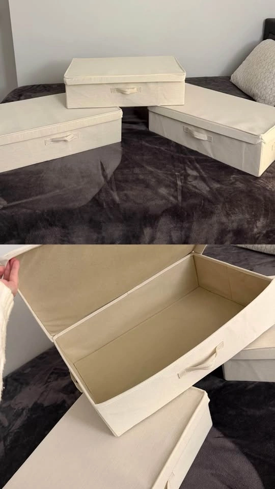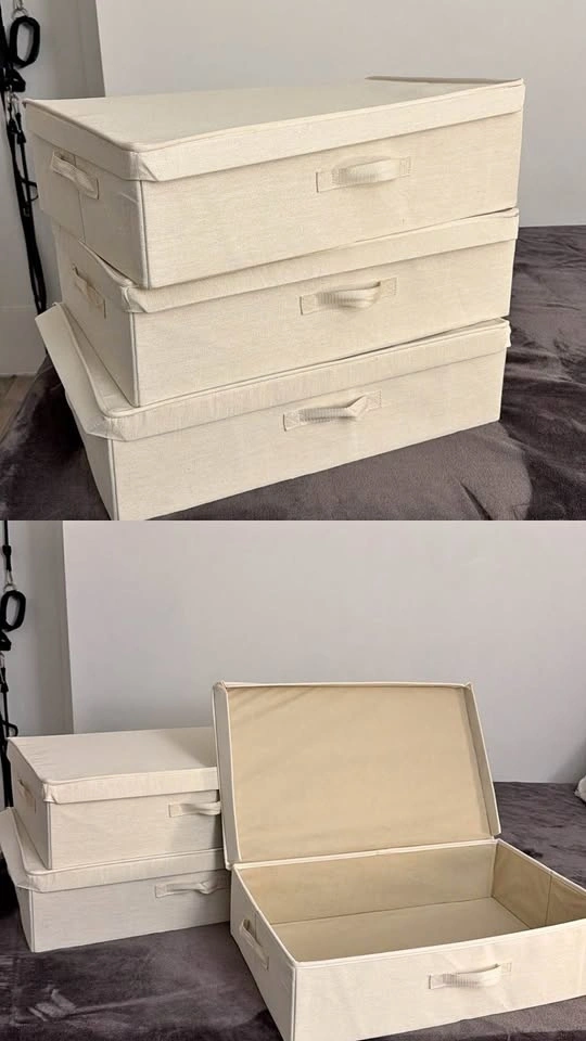 Selling 3 fabric storage organizers with lids – great for under-bed storage, closets, or seasonal items.