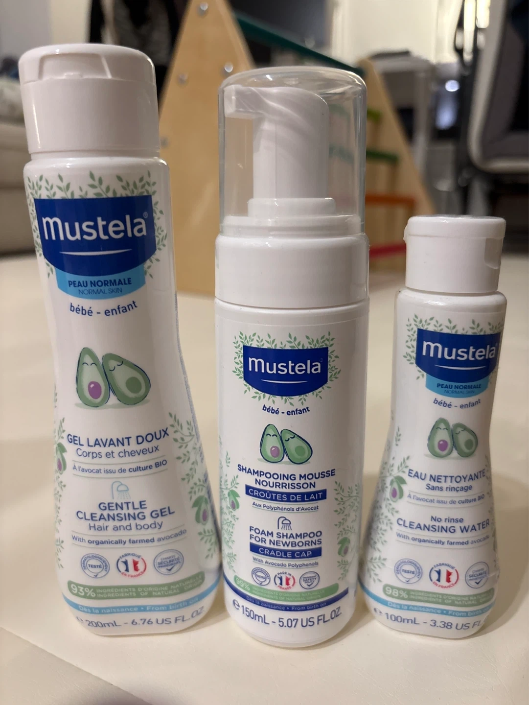 This new unopened Mustela baby skincare set includes a Gentle Cleansing Gel (200mL), Foam Shampoo for Newborns (150mL), and No Rinse Cleansing Water (100mL). All are formulated for normal skin and suitable from birth. They feature organically farmed avocado.