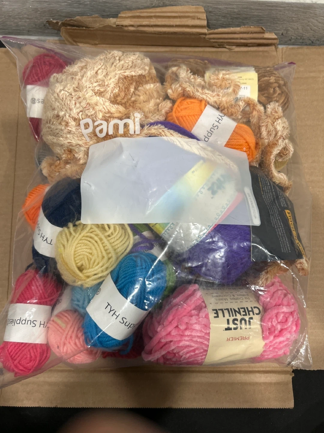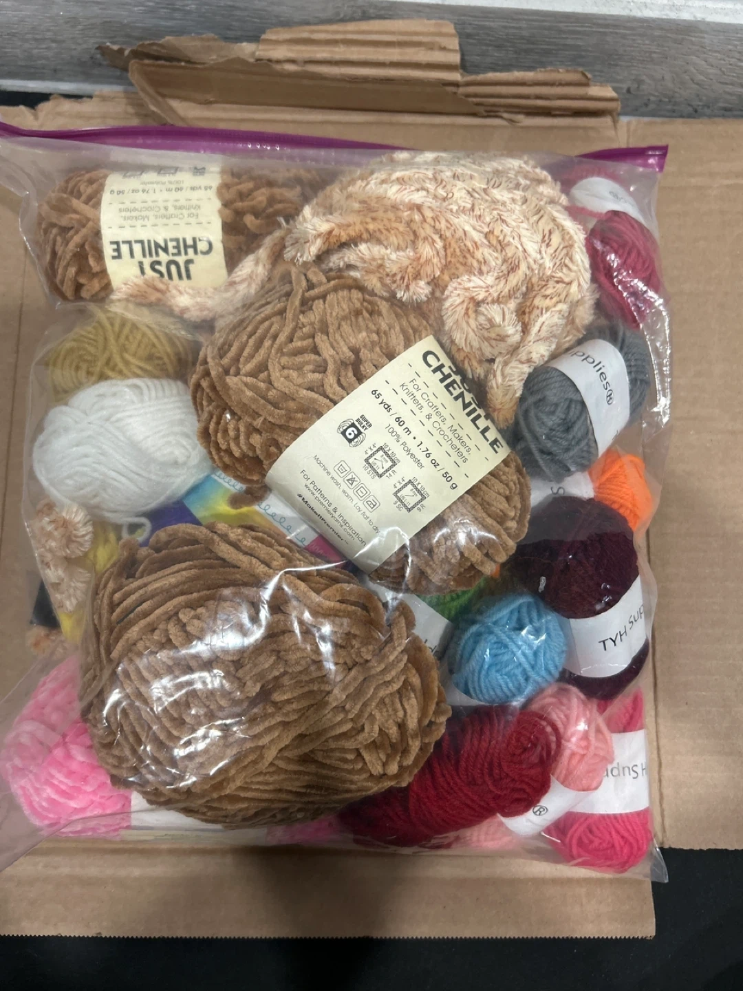 This bundle includes various colors and textures of yarn. Most skeins appear to be chenille or similar soft material. They're great for knitting, crocheting, or other craft projects!