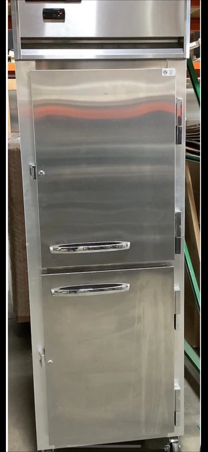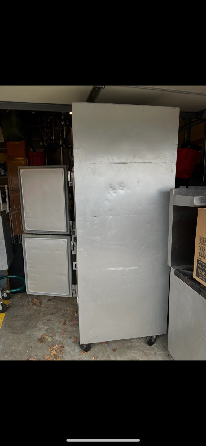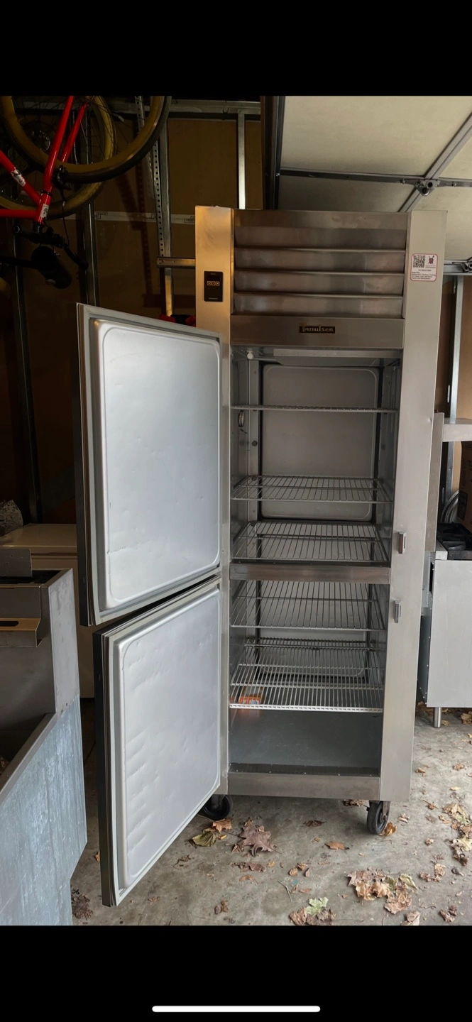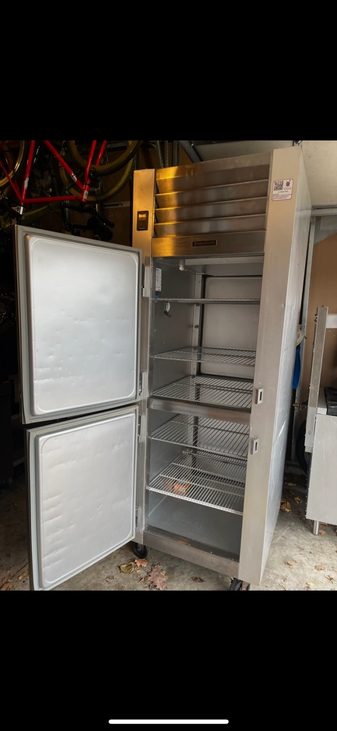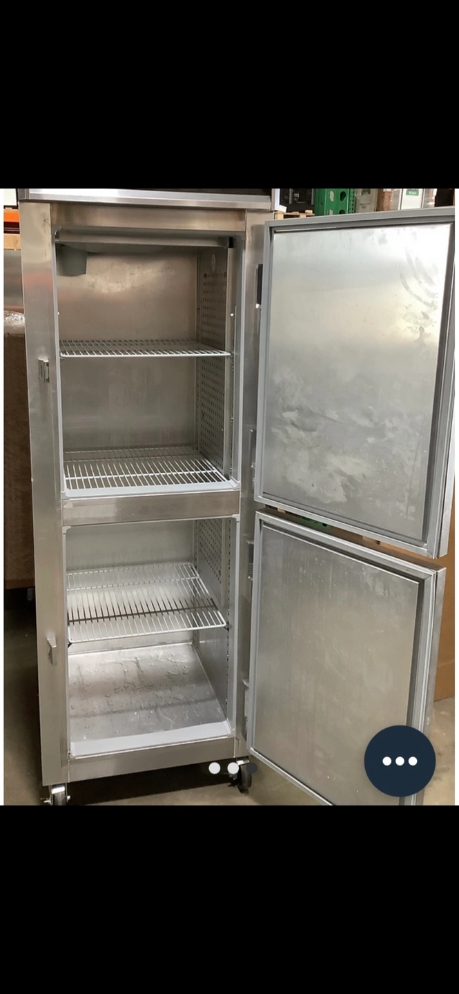 Commercial-grade stainless steel reach-in refrigerator. Two doors, three shelves per door. Wheels for mobility. Used but good condition a few nic’s on the side.