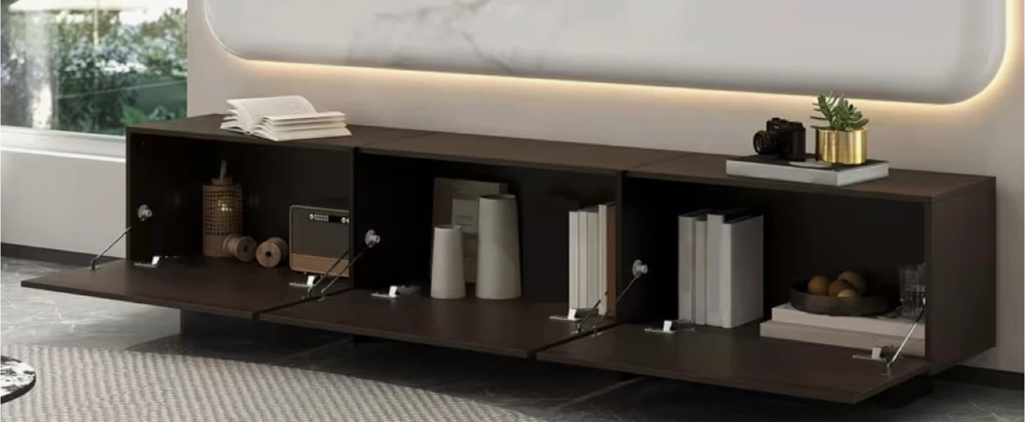 This media console features a dark brown finish and three cabinet doors that open downwards. It's designed with a sleek, modern look. Plenty of storage space inside for media equipment or general storage. One section cardboard back left open to allow wires to discreetly connect to devices.