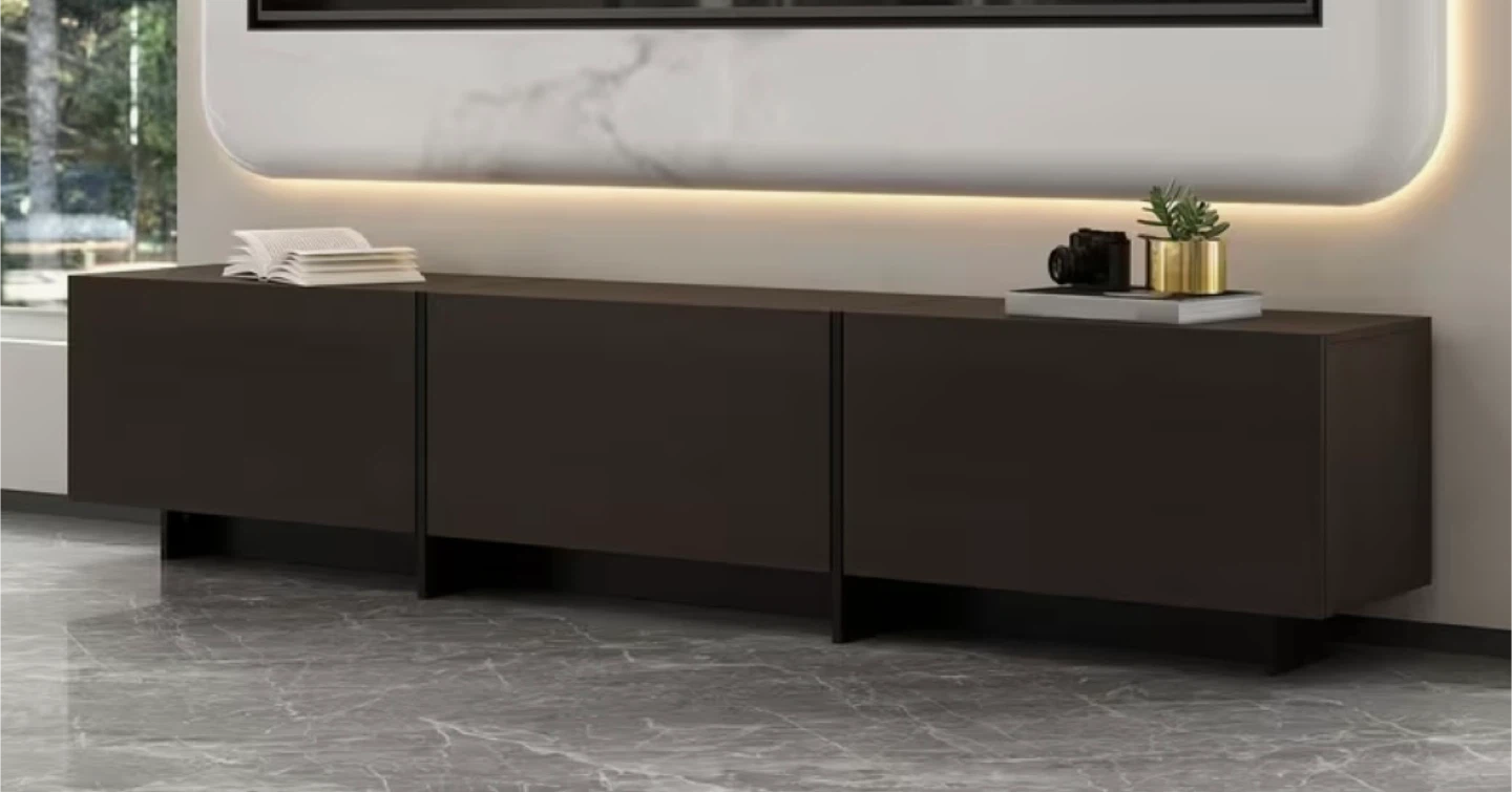 This media console features a dark brown finish and three cabinet doors that open downwards. It's designed with a sleek, modern look. Plenty of storage space inside for media equipment or general storage. One section cardboard back left open to allow wires to discreetly connect to devices.