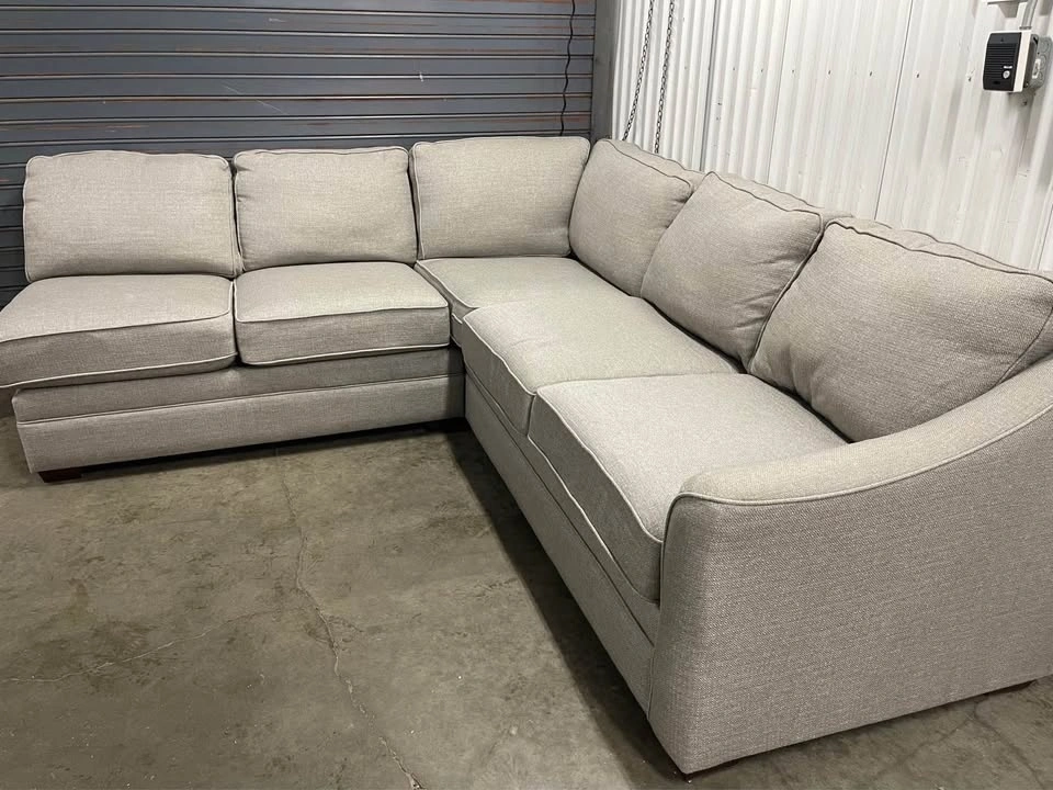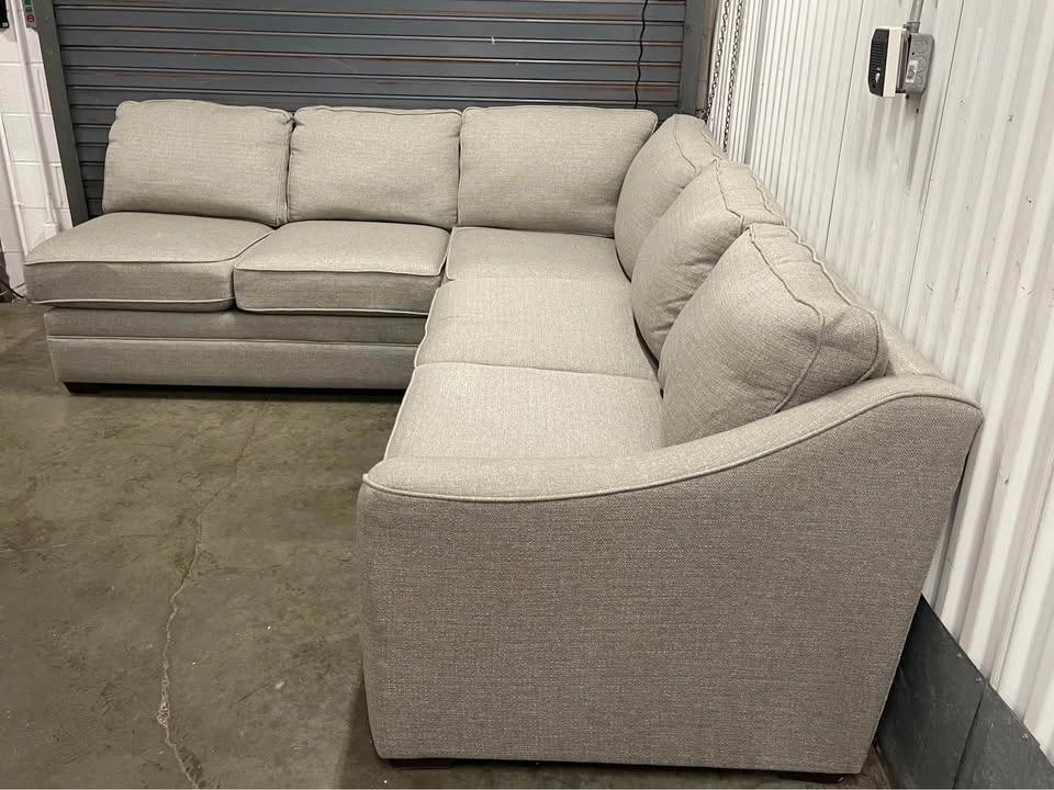 Beautiful L-shaped sectional sofa in a neutral gray fabric. Very comfortable with deep seating and plush cushions—perfect for a living room, apartment, or family space. Modern design that matches almost any décor. Pick up available in the Bronx. Great piece if you’re looking to upgrade your space without paying store prices.