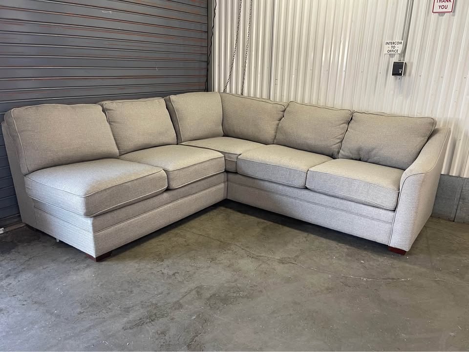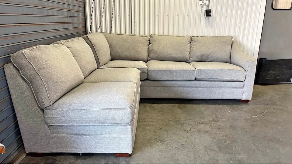 Beautiful L-shaped sectional sofa in a neutral gray fabric. Very comfortable with deep seating and plush cushions—perfect for a living room, apartment, or family space. Modern design that matches almost any décor. Pick up available in the Bronx. Great piece if you’re looking to upgrade your space without paying store prices.