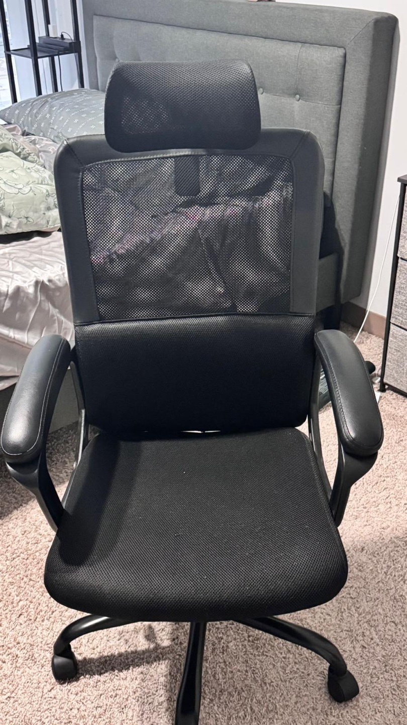 Comfortable office chair. Features mesh back, adjustable height, headrest, and armrests. Great for home or office use. Used condition.