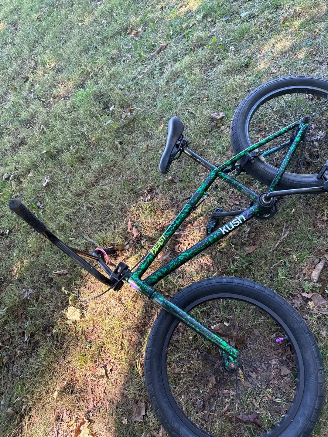 Selling a Kush BMX bike. It features a green and black frame with a unique leaf pattern. Great for riders looking for a stylish and functional bike