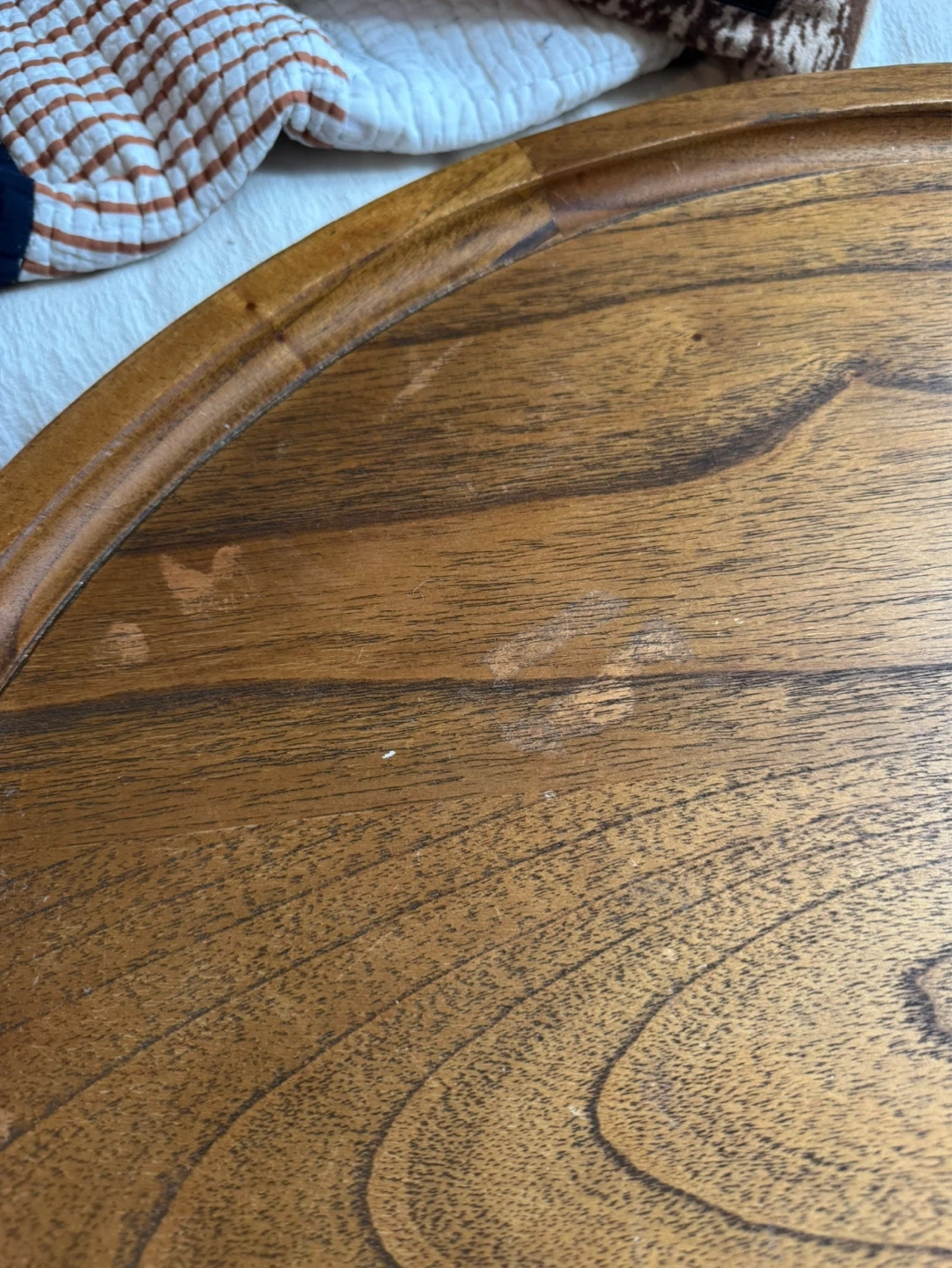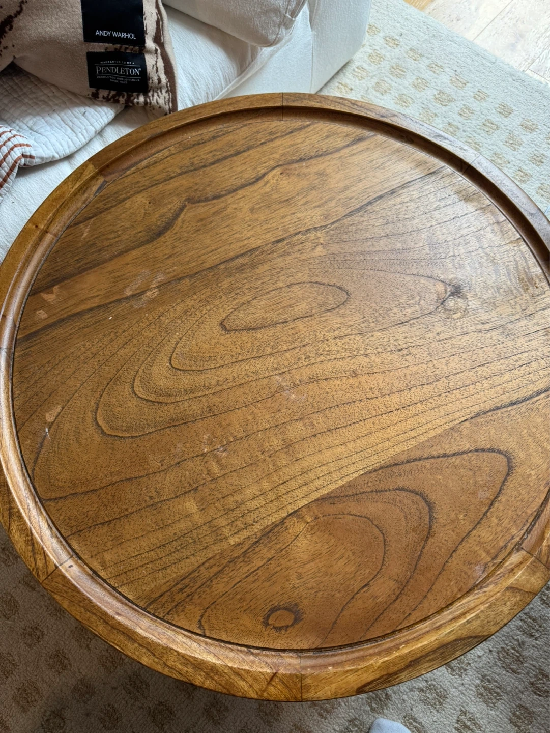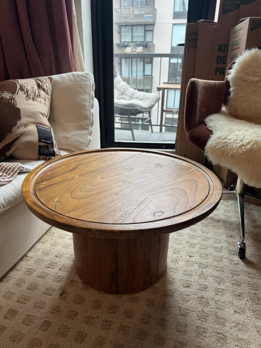 Beautiful round wooden accent table with a drum-style base. Super versatile and fits with all types of decor! Top has visible cosmetic damage, it has been well loved :) Original price $450