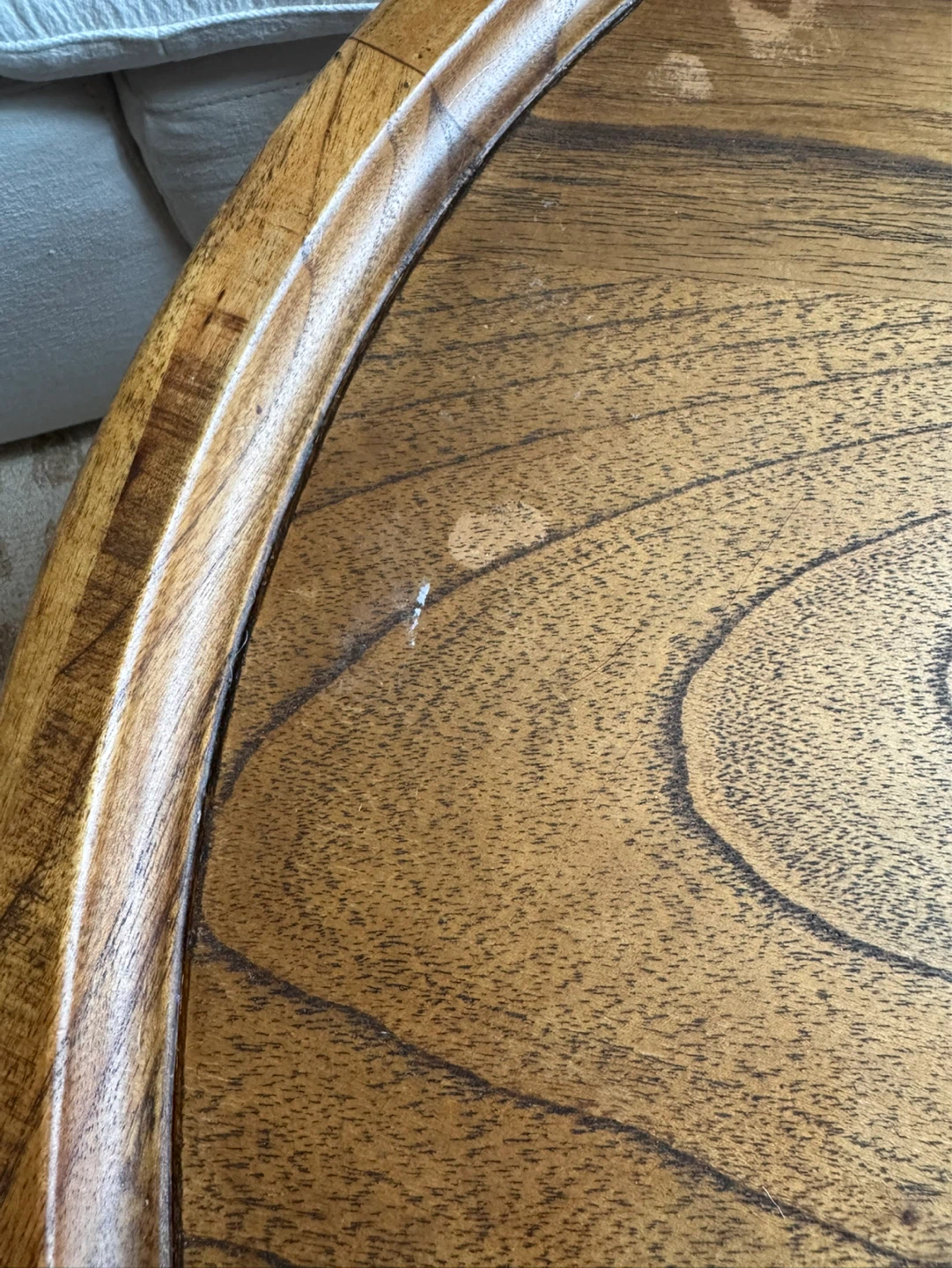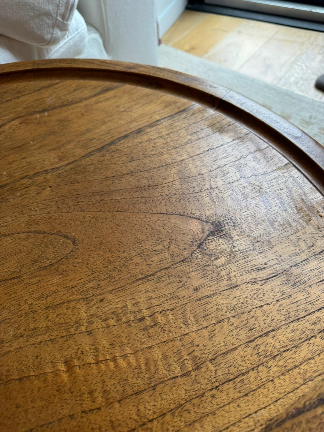 Beautiful round wooden accent table with a drum-style base. Super versatile and fits with all types of decor! Top has visible cosmetic damage, it has been well loved :) Original price $450