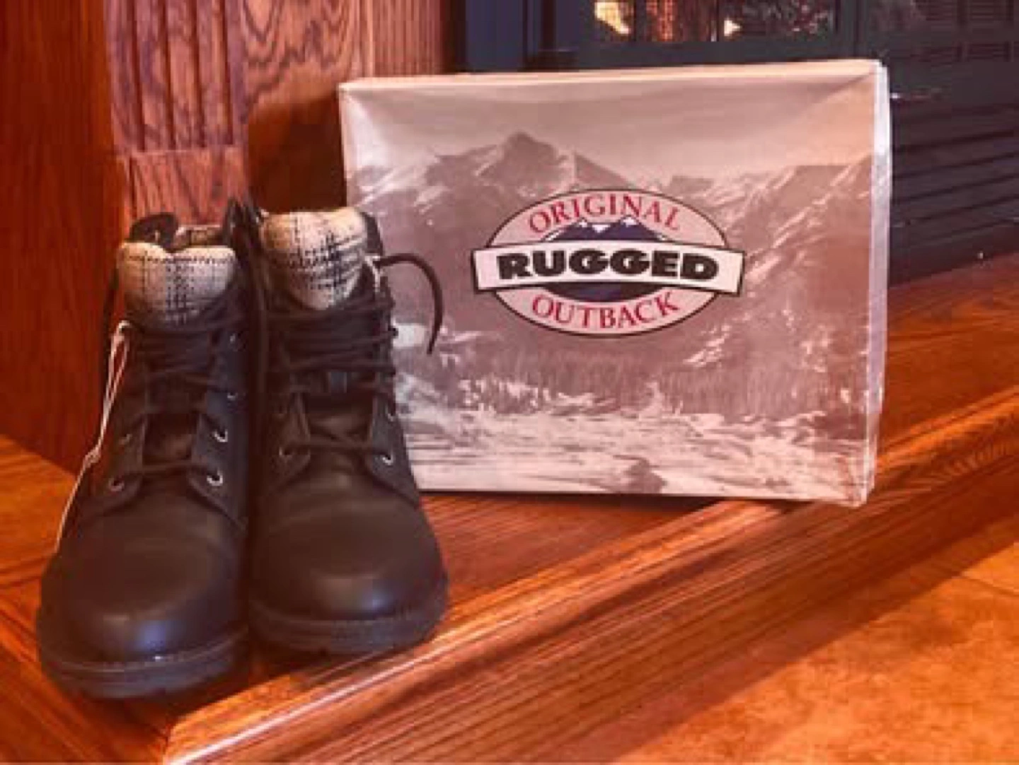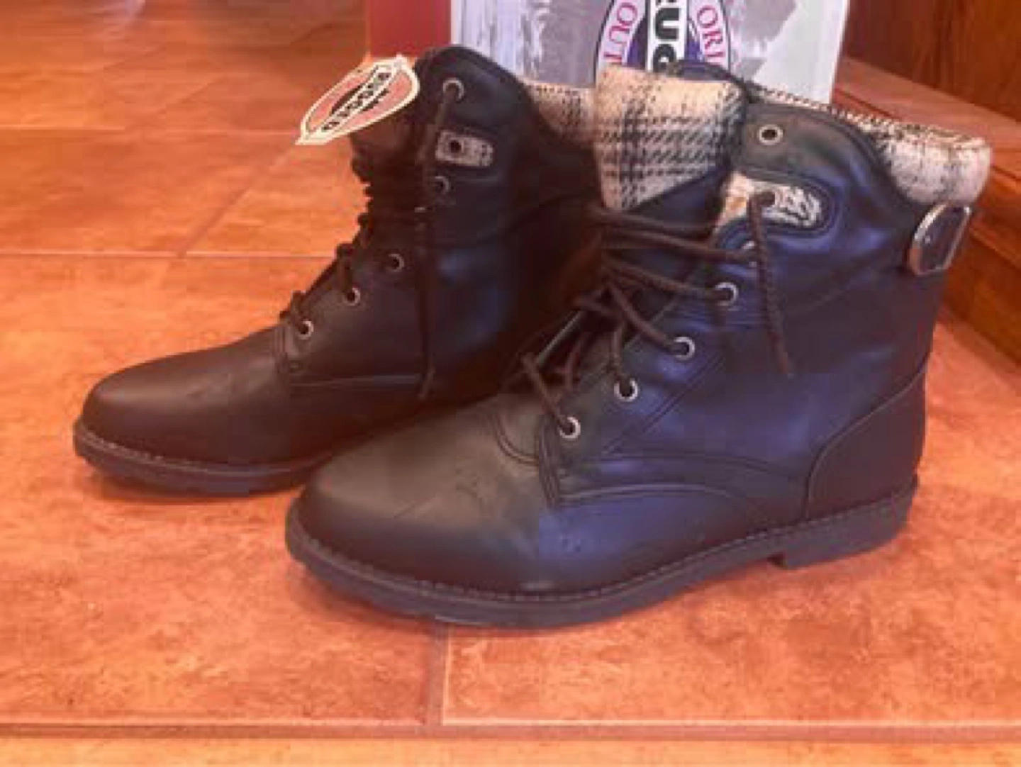 Women's Rugged Outback ankle boots in size 9. These booties come in black and feature a faux leather outsole. The style is perfect for everyday wear and the black color makes them versatile. The boots also come with a brown and white sweater accent, adding a touch of style to the design.