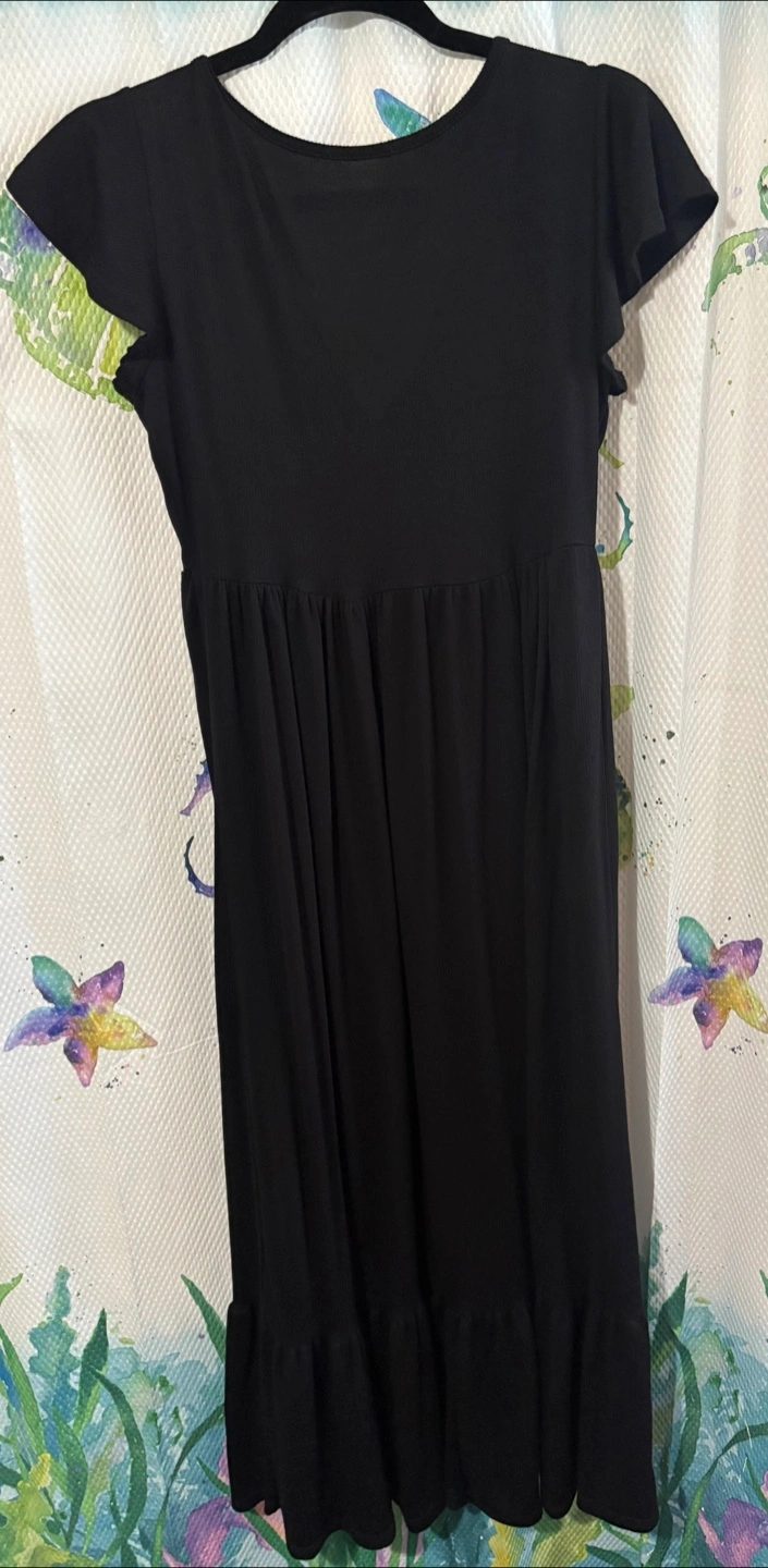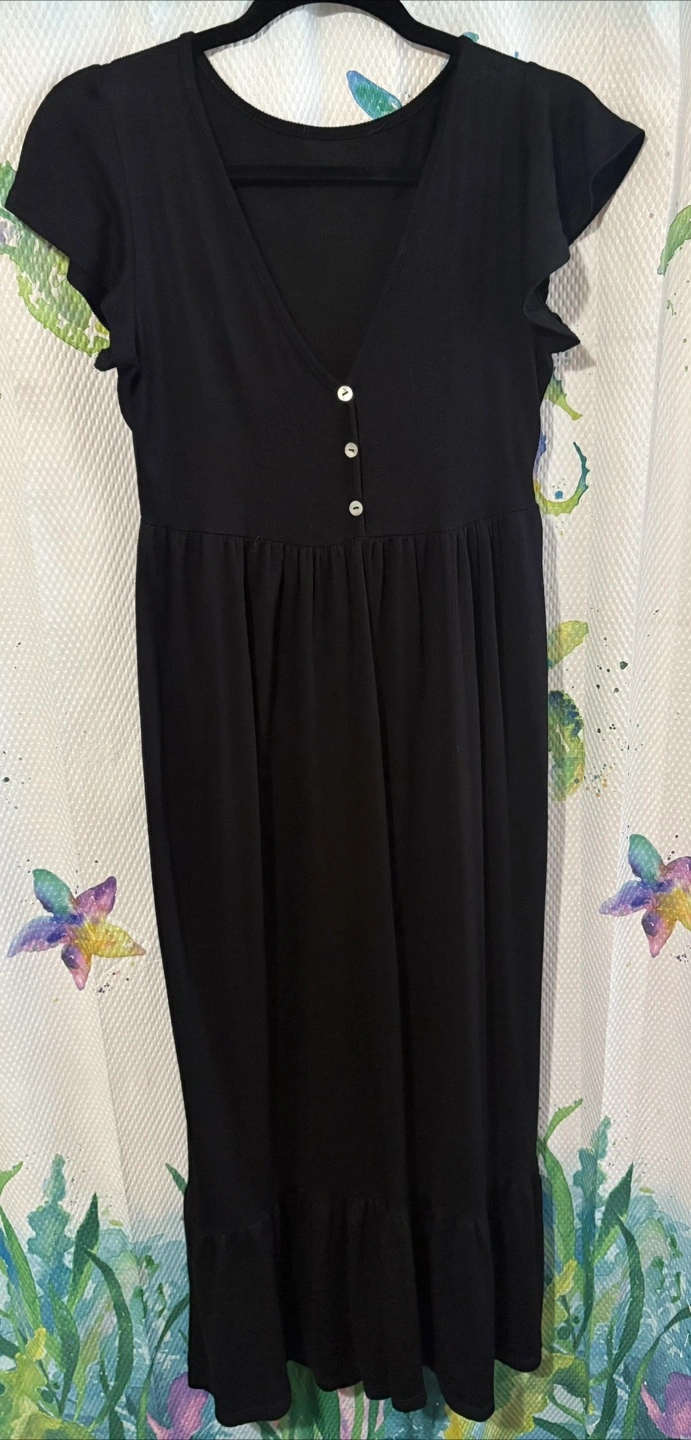 Gently used cute black dress with flutter sleeves! It has a V-neck and button detailing on the top. Size L and ready for a new home.
