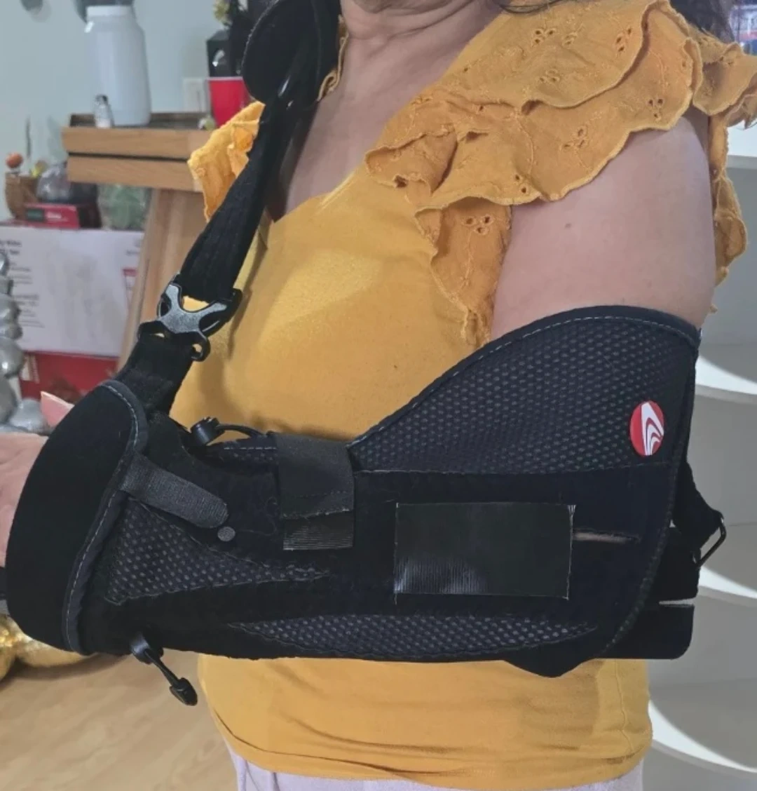 This is a black arm sling designed for support and comfort. It features adjustable straps for a secure fit. The material is breathable for extended wear.