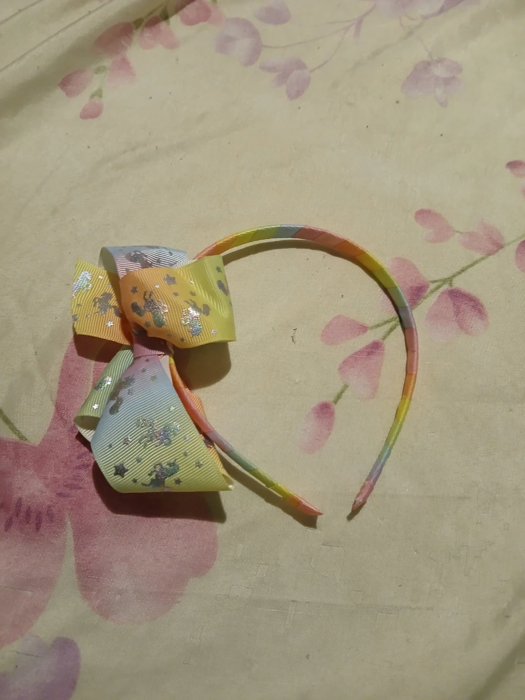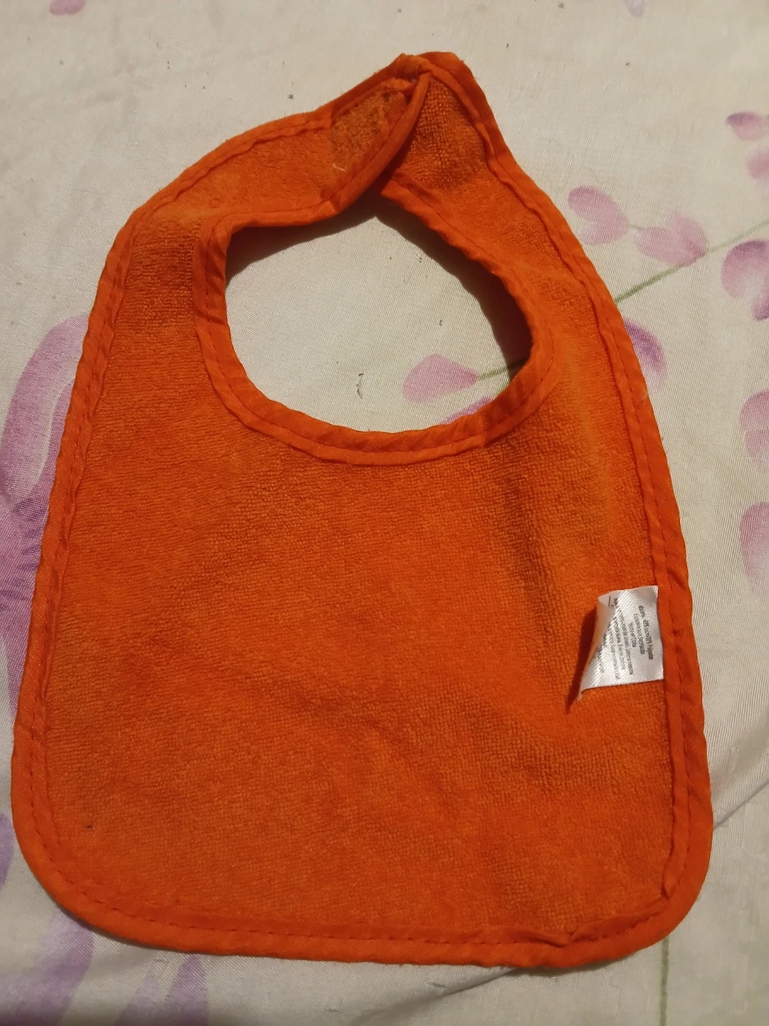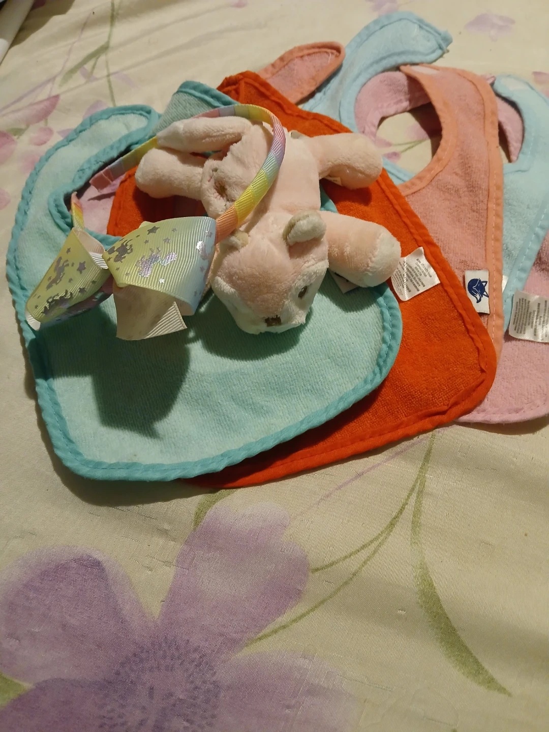 This is a set of terry cloth baby bibs in pink, blue, and orange. They're soft and absorbent for mealtime. The bibs are machine washable. A rainbow headband and a plush toy