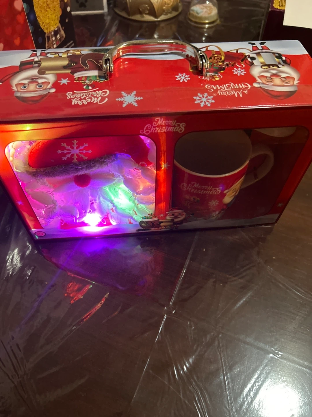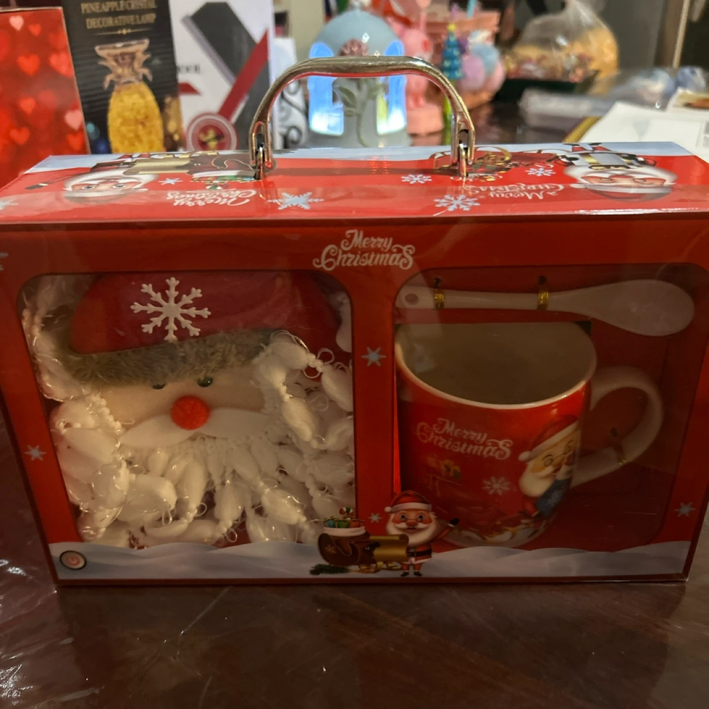 I'm selling a brand new Christmas-themed mug set that comes in its original box! The set includes a festive mug, a matching spoon, and an adorable Santa plush toy. Perfect for adding some holiday cheer to your mornings or as a gift for someone special