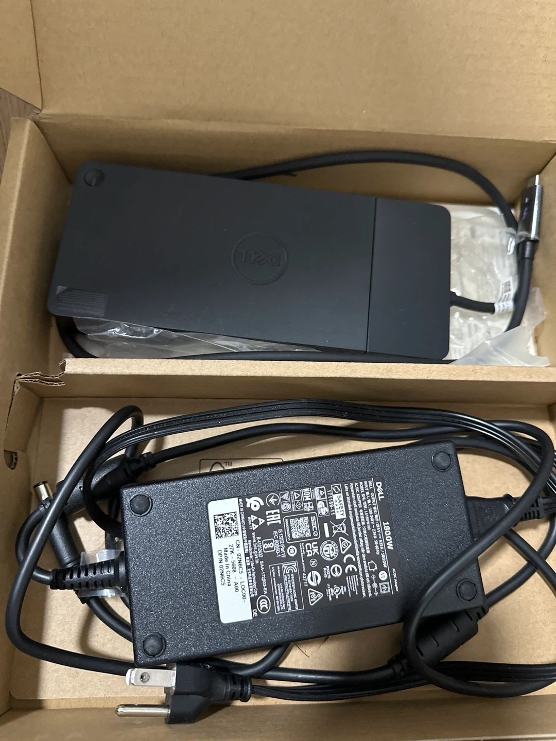 This is a brand new Dell 180W AC adapter and laptop charger, aka docker or docking station for laptops. It includes the power brick and necessary cables. This adapter's output is 19.5V, 9.23A.