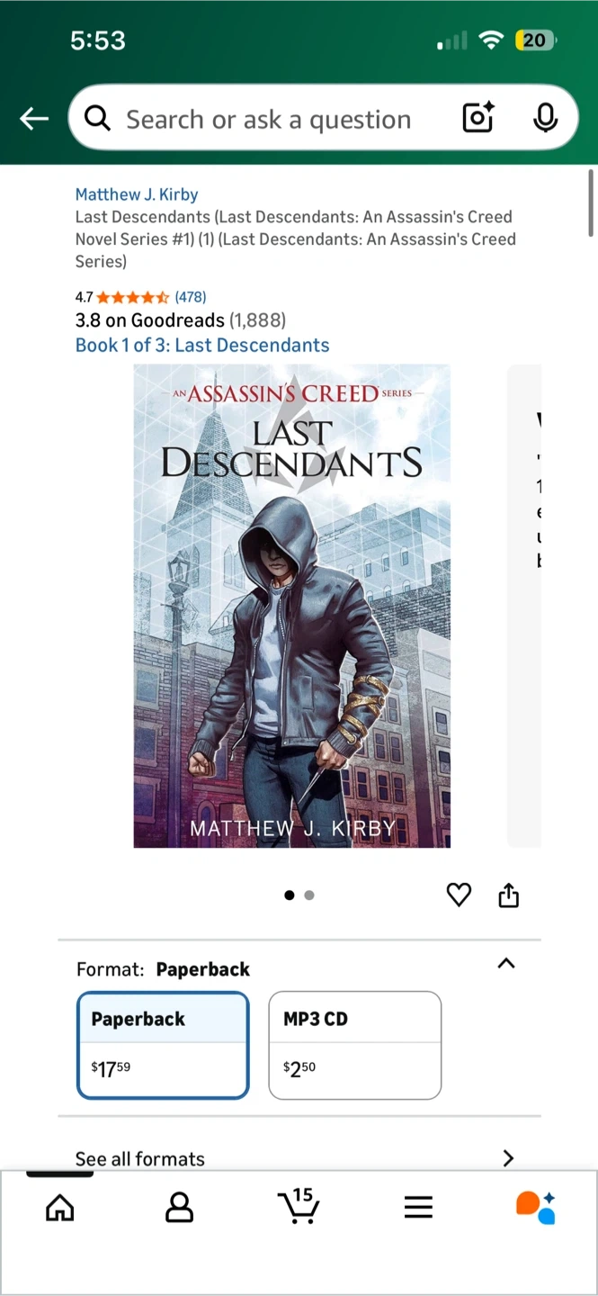 Selling a copy of Last Descendants, part of the Assassin's Creed series by Matthew J. Kirby! It's the first book in the Last Descendants series, perfect for fans of the Assassin's Creed universe