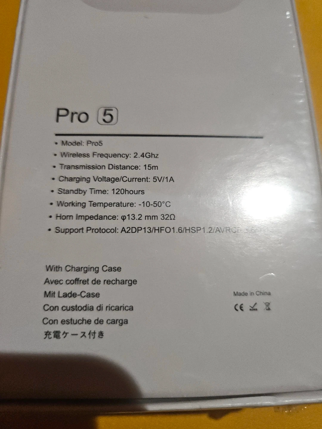 These Pro 5 wireless earbuds come with a charging case. They support a 2.4GHz wireless frequency with a transmission distance of 15 meters. Standby time is 120 hours.