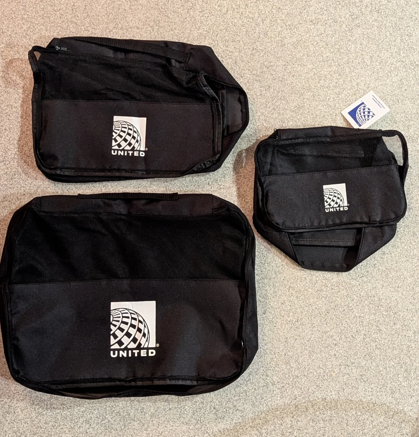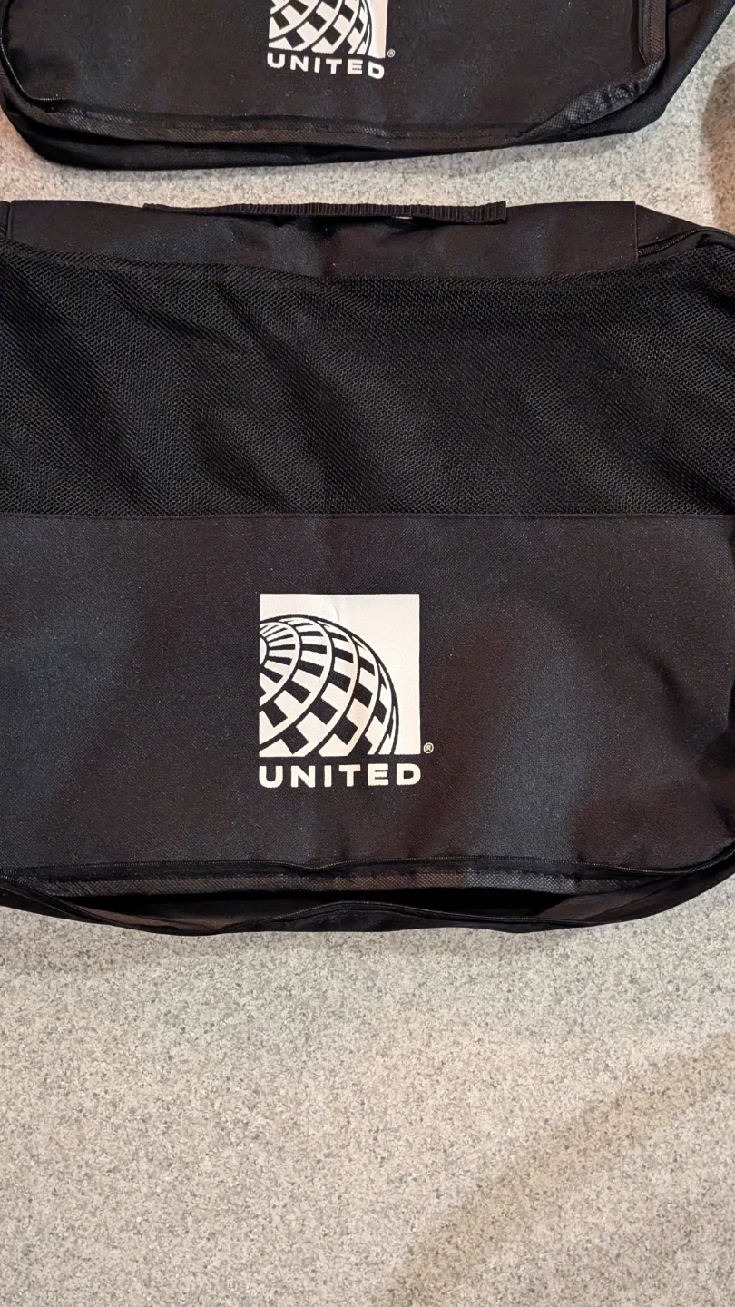 Selling a set of three black travel bags from United Airlines. They appear to be in great condition and come in varying sizes. Perfect for organizing your travel essentials!