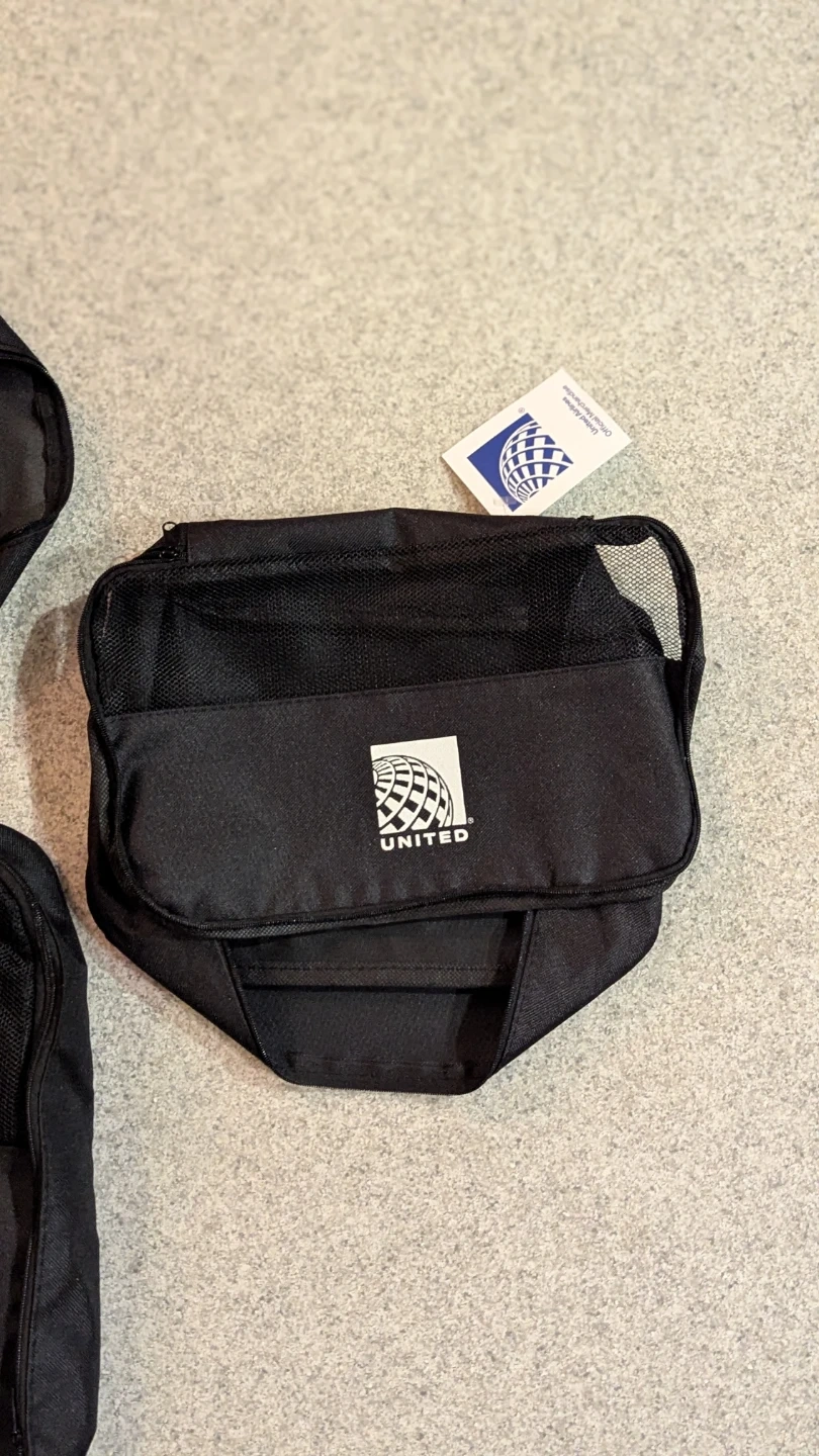 Selling a set of three black travel bags from United Airlines. They appear to be in great condition and come in varying sizes. Perfect for organizing your travel essentials!